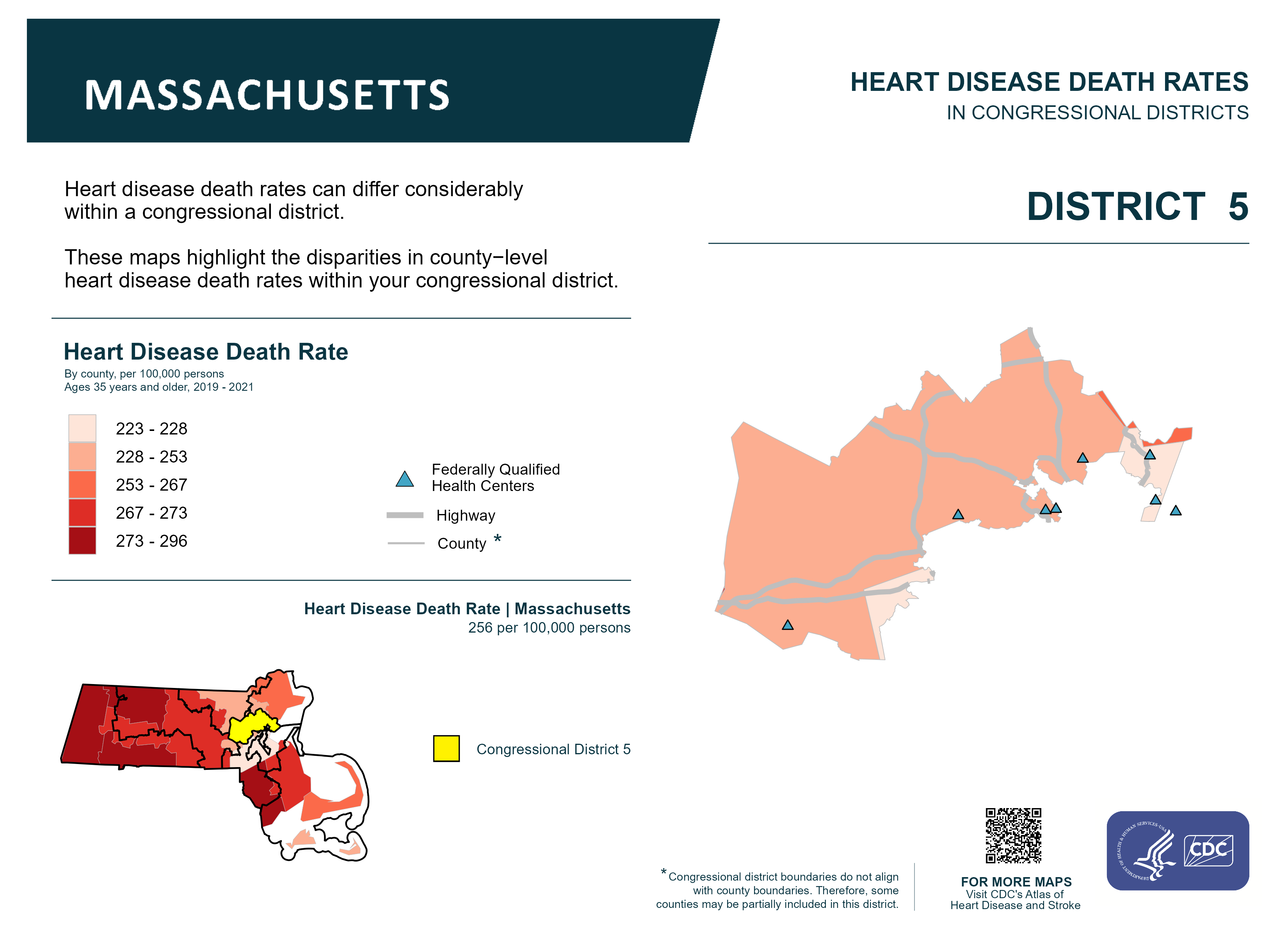 MA: Congressional District 05, Heart Disease and Federally Qualified Health Centers Map [118th Congress]