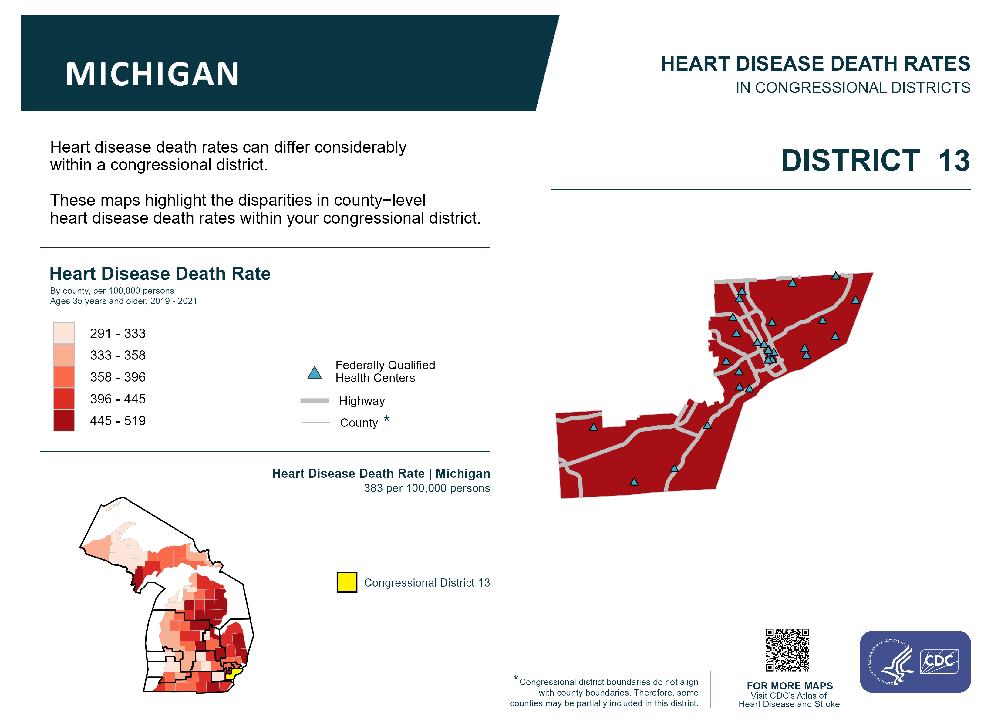 MI: Congressional District 13, Heart Disease and Federally Qualified Health Centers Map [118th Congress]