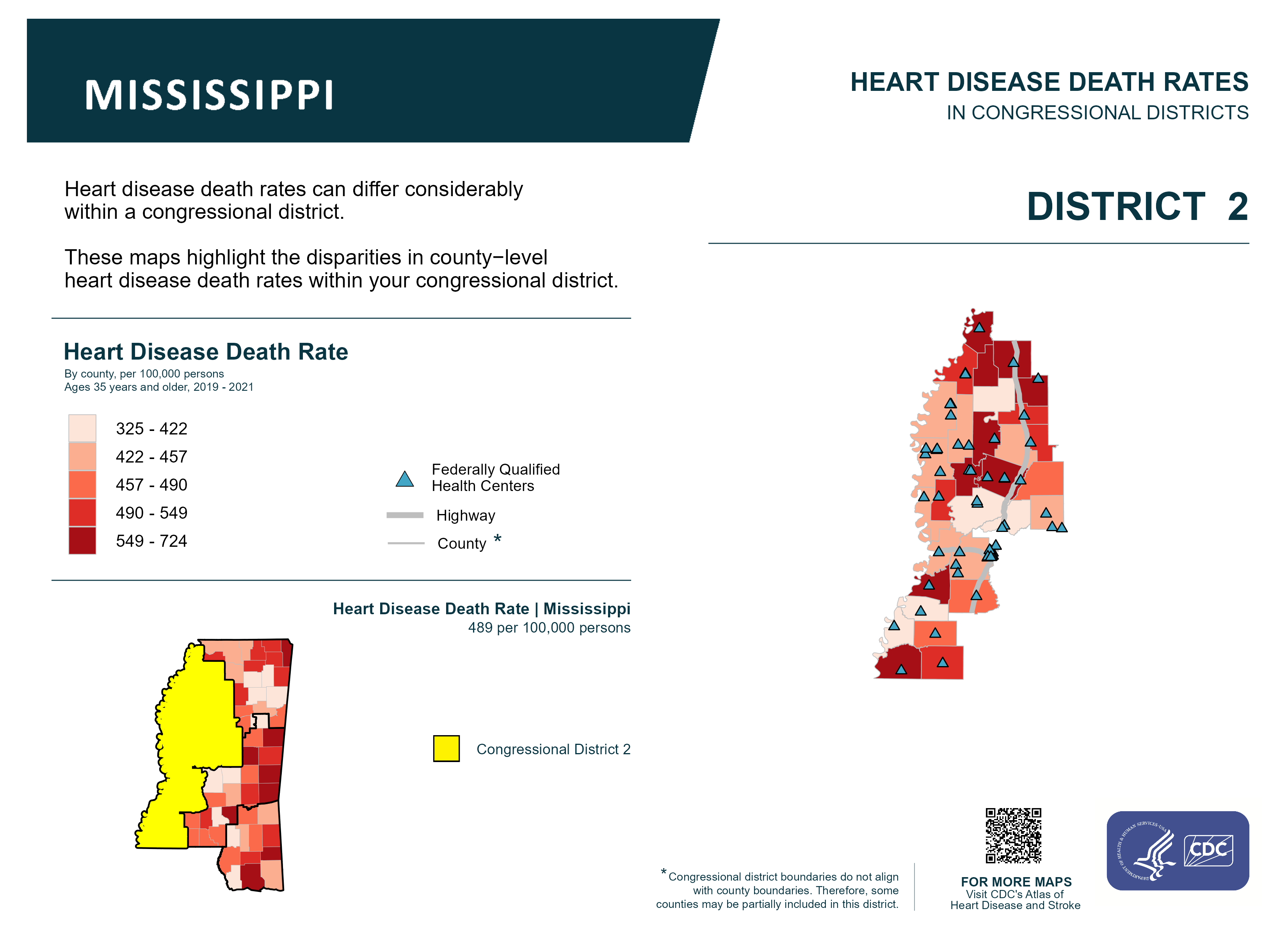 Description:Heart disease death rates can differ considerably within a congressional district. These maps highlight the disparities in county-level heart disease death rates within your congressional district. This map represents data for Mississippi Congressional District 02.