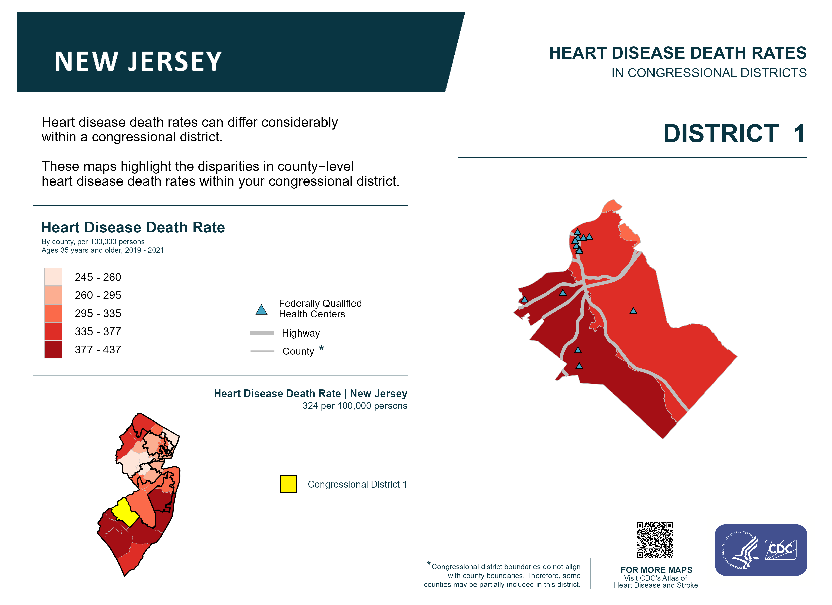 NJ: Congressional District 01, Heart Disease and Federally Qualified Health Centers Map [118th Congress]