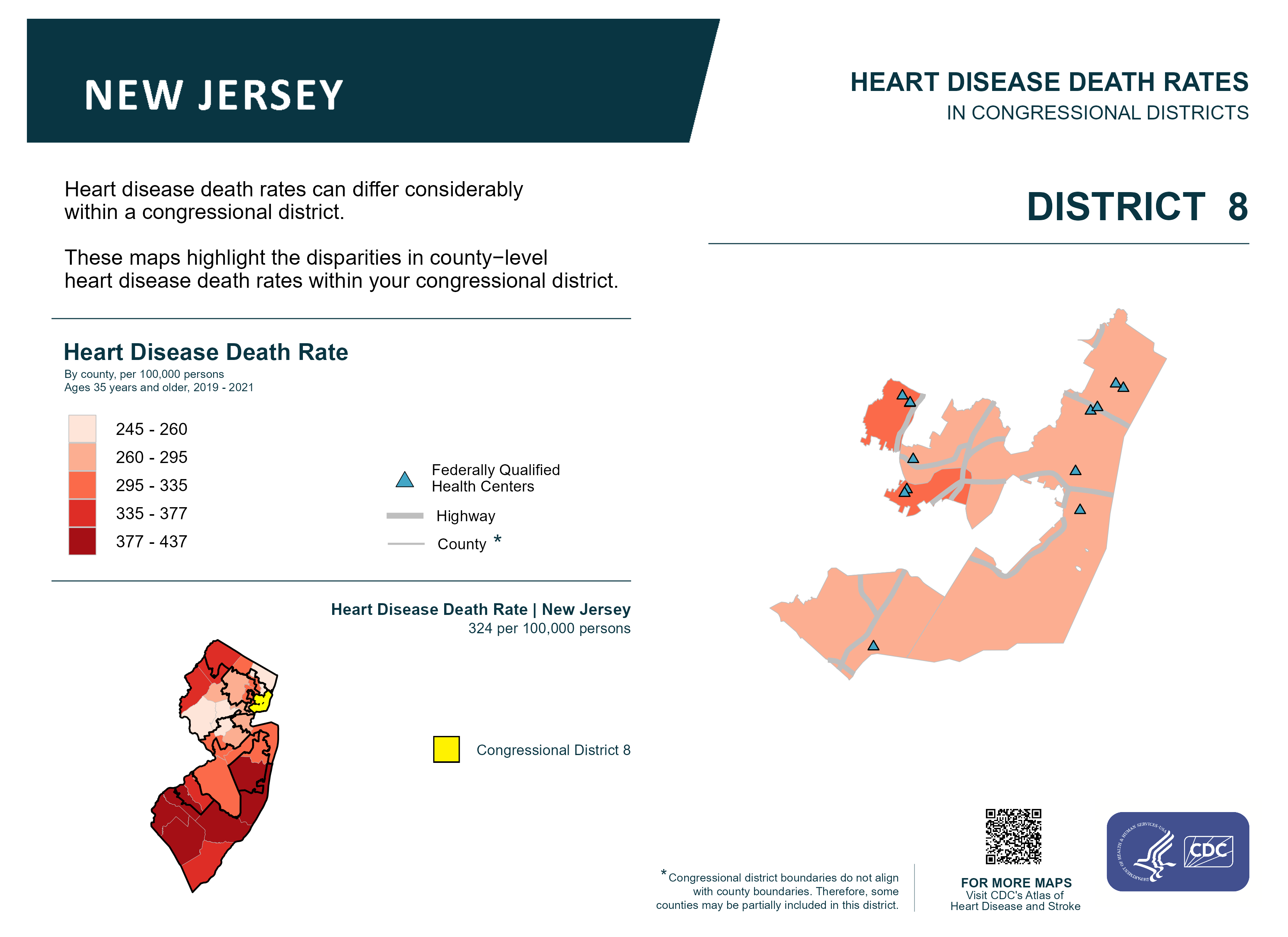 NJ: Congressional District 08, Heart Disease and Federally Qualified Health Centers Map [118th Congress]