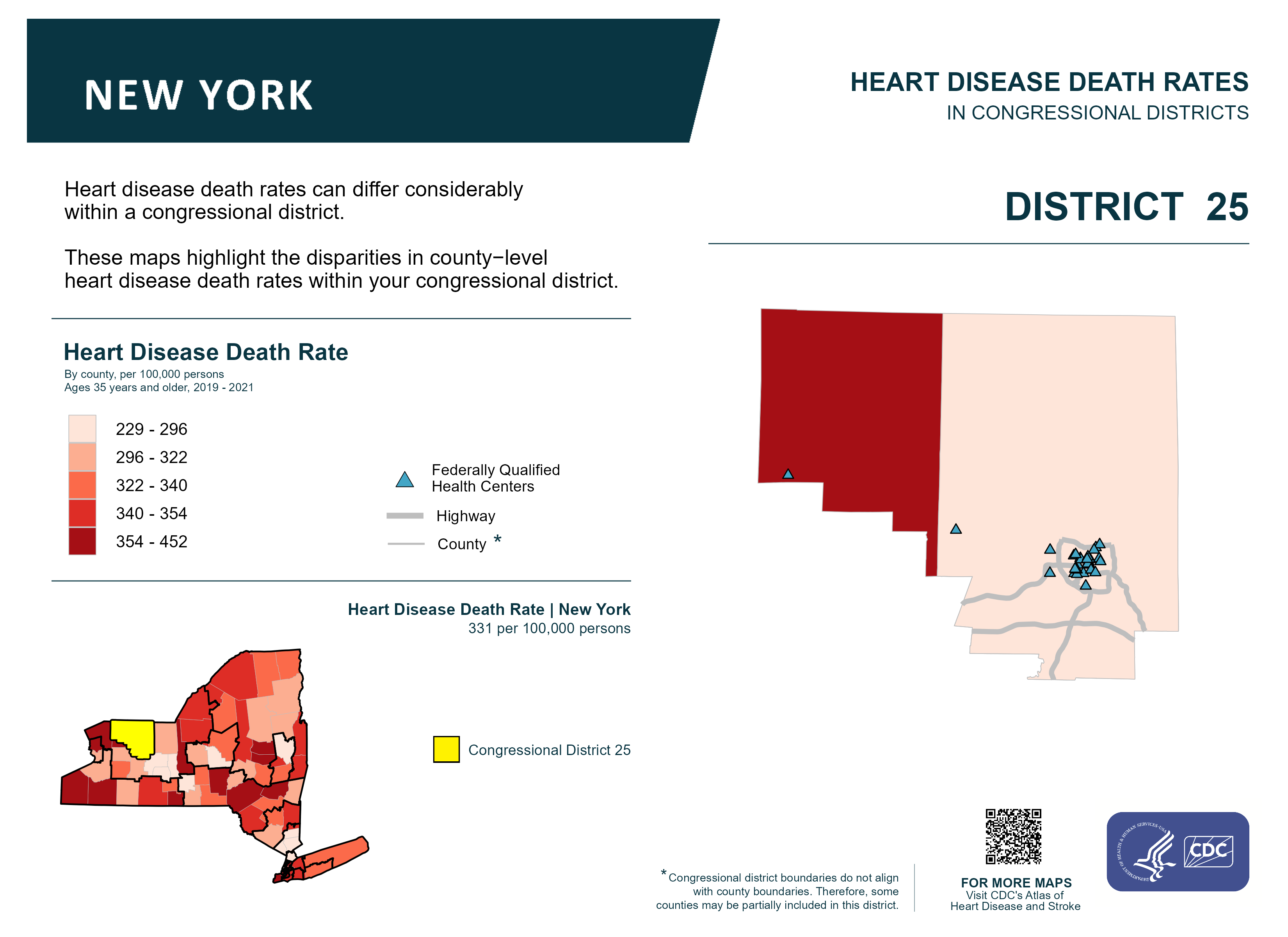 NY: Congressional District 25, Heart Disease and Federally Qualified Health Centers Map [118th Congress]