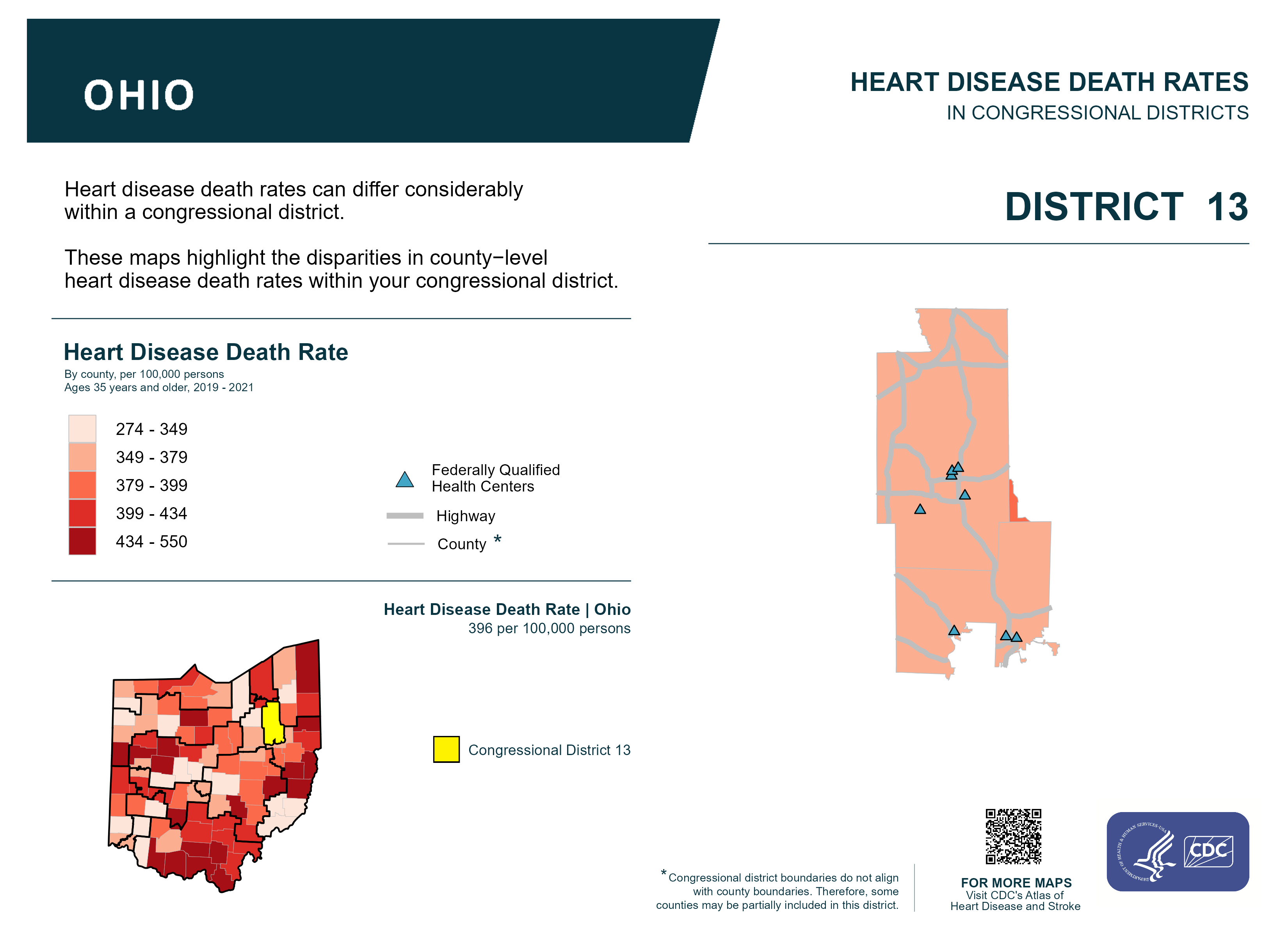 OH: Congressional District 13, Heart Disease and Federally Qualified Health Centers Map [118th Congress]
