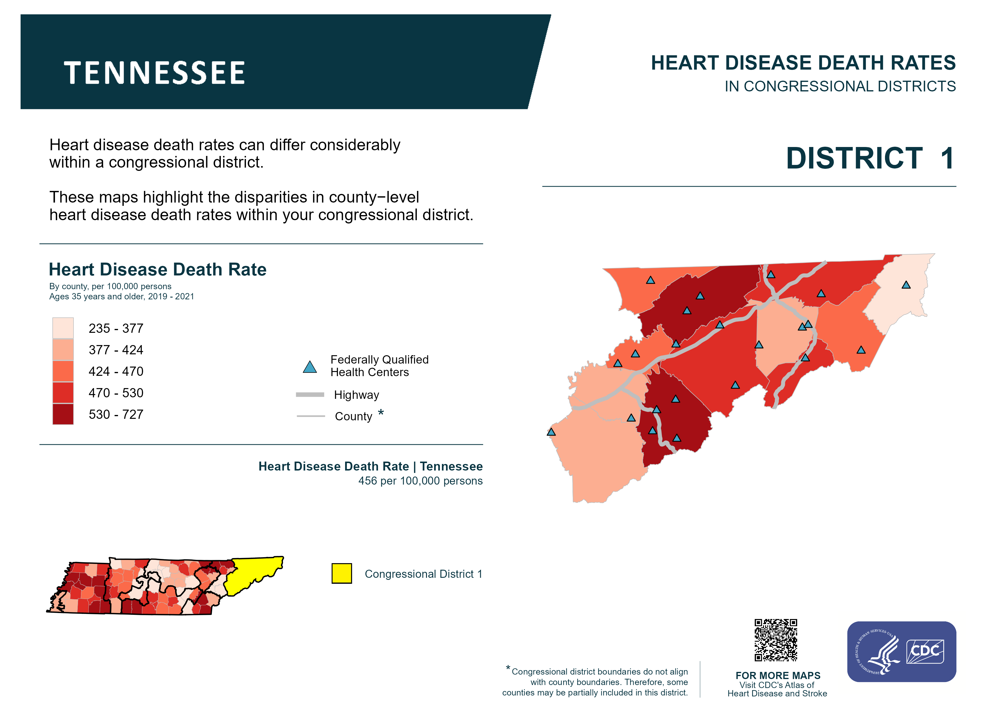 TN: Congressional District 01, Heart Disease and Federally Qualified Health Centers Map [118th Congress]