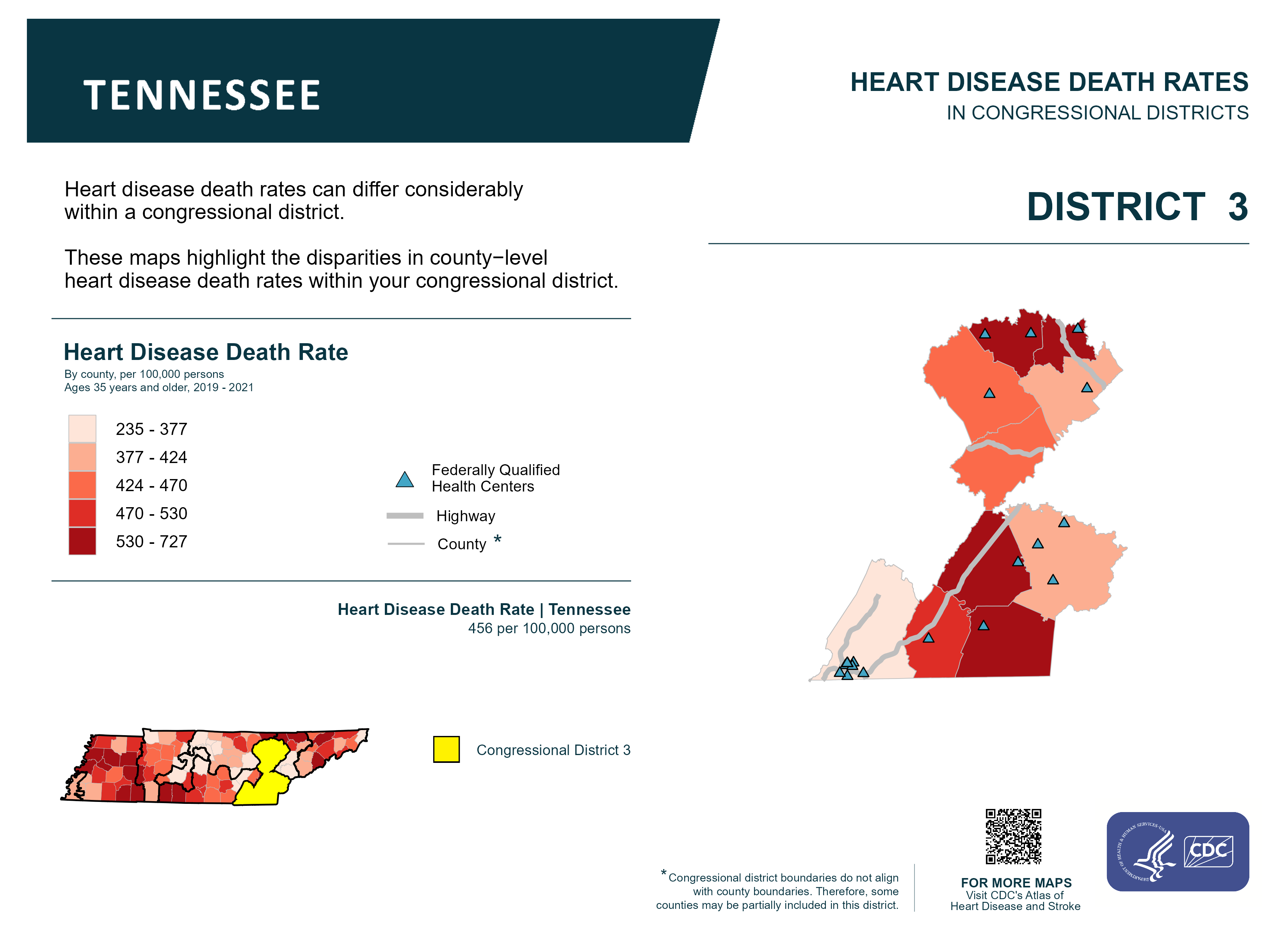 TN: Congressional District 03, Heart Disease and Federally Qualified Health Centers Map [118th Congress]