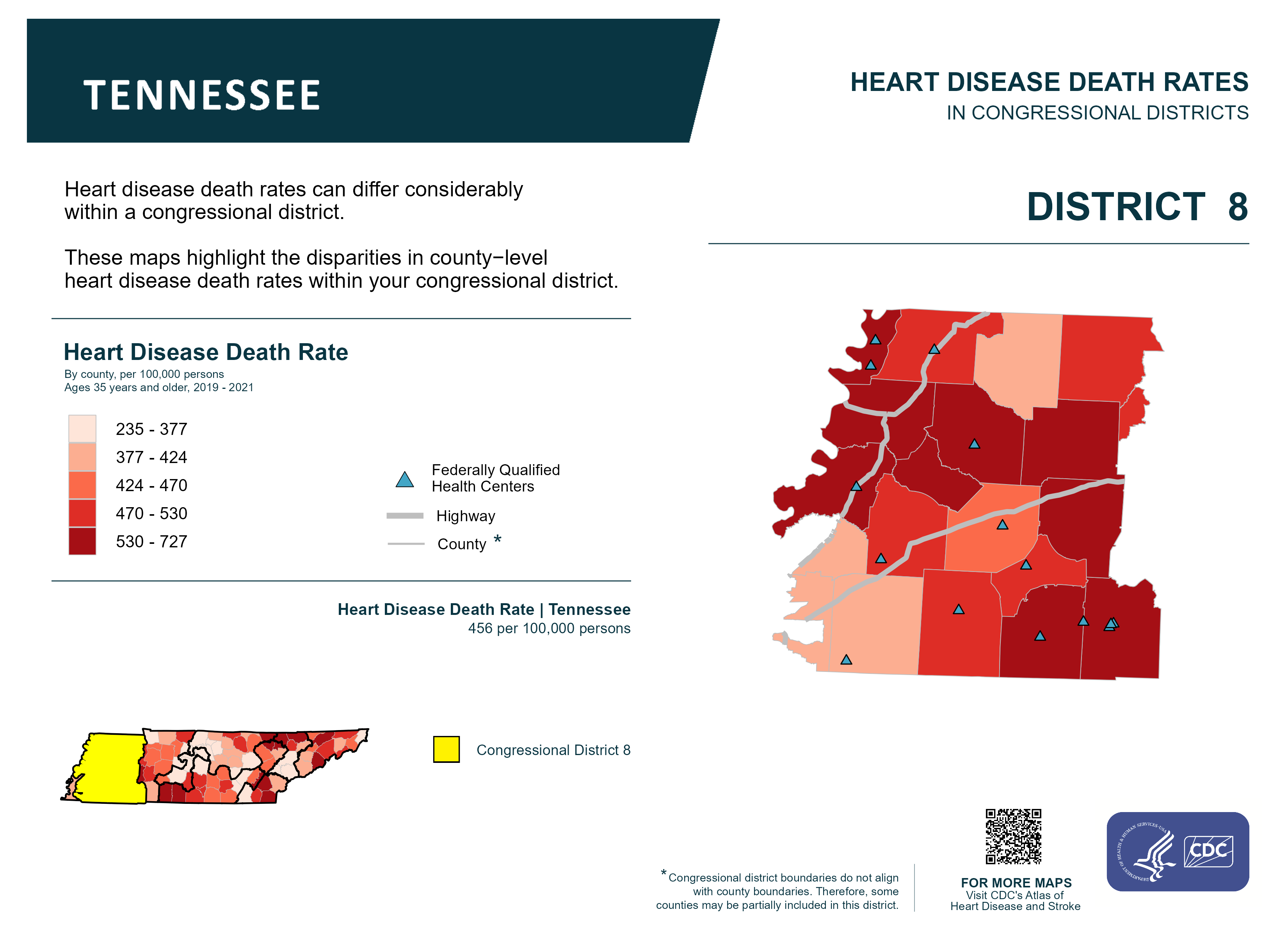TN: Congressional District 08, Heart Disease and Federally Qualified Health Centers Map [118th Congress]