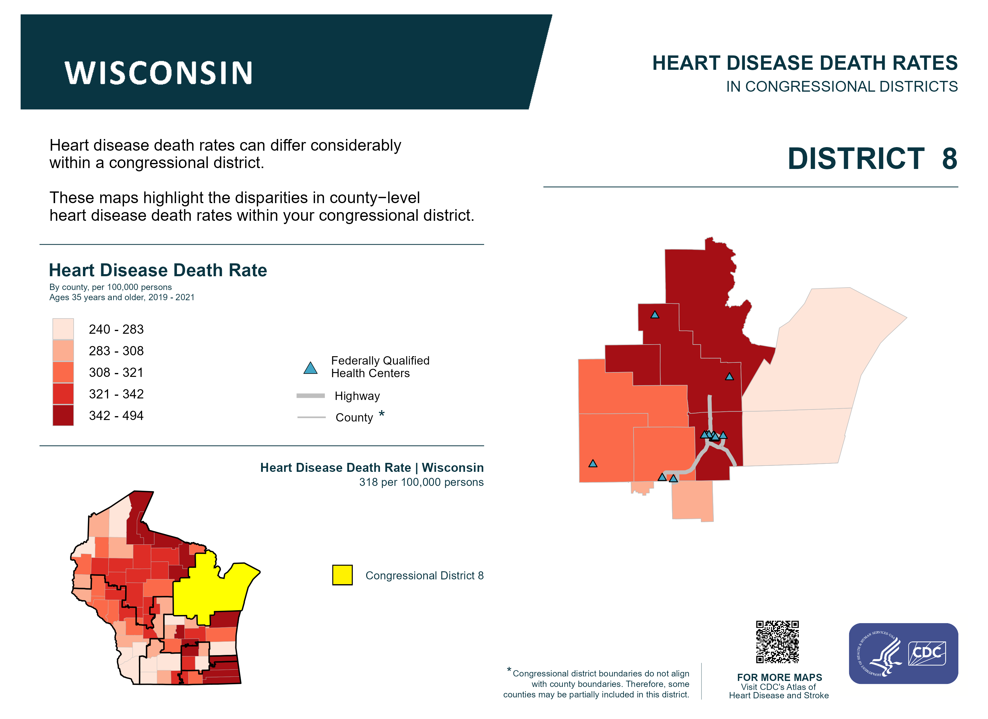 WI: Congressional District 08, Heart Disease and Federally Qualified Health Centers Map [118th Congress]