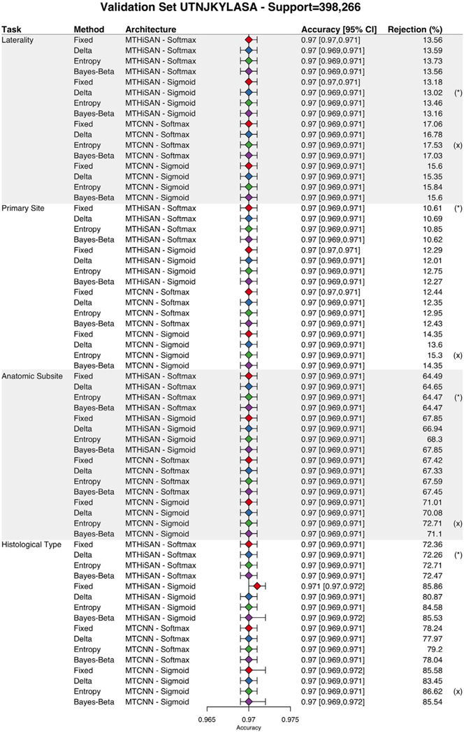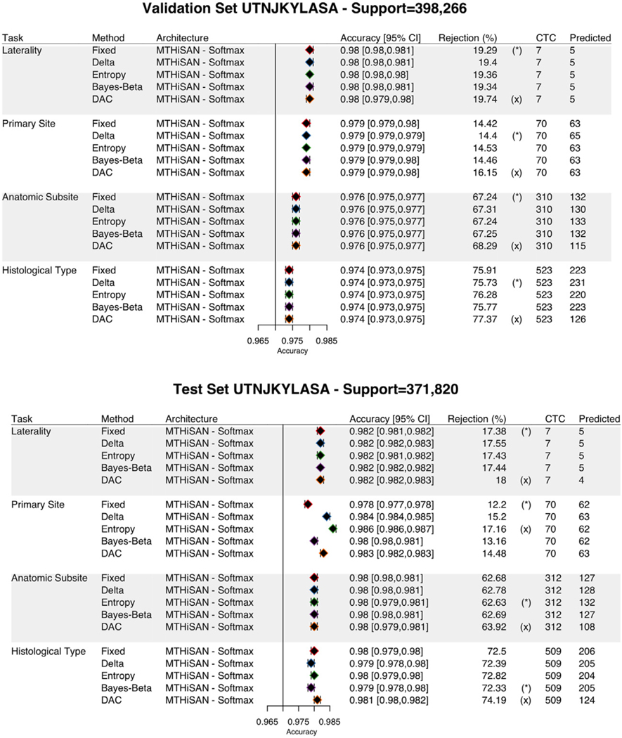 In this paper, we demonstrate the use of DNN-based classification tools to benefit cancer registries by automating information extraction of disease at diagnosis and at surgery from electronic text pathology reports from the US National Cancer Institute (NCI) Surveillance, Epidemiology, and End Results (SEER) population-based cancer registries. In particular, we introduce multiple methods for selective classification to achieve a target level of accuracy on multiple classification tasks while minimizing the rejection amount—that is, the number of electronic pathology reports for which the model’s predictions are unreliable. We evaluate the proposed methods by comparing our approach with the current in-house deep learning-based abstaining classifier.