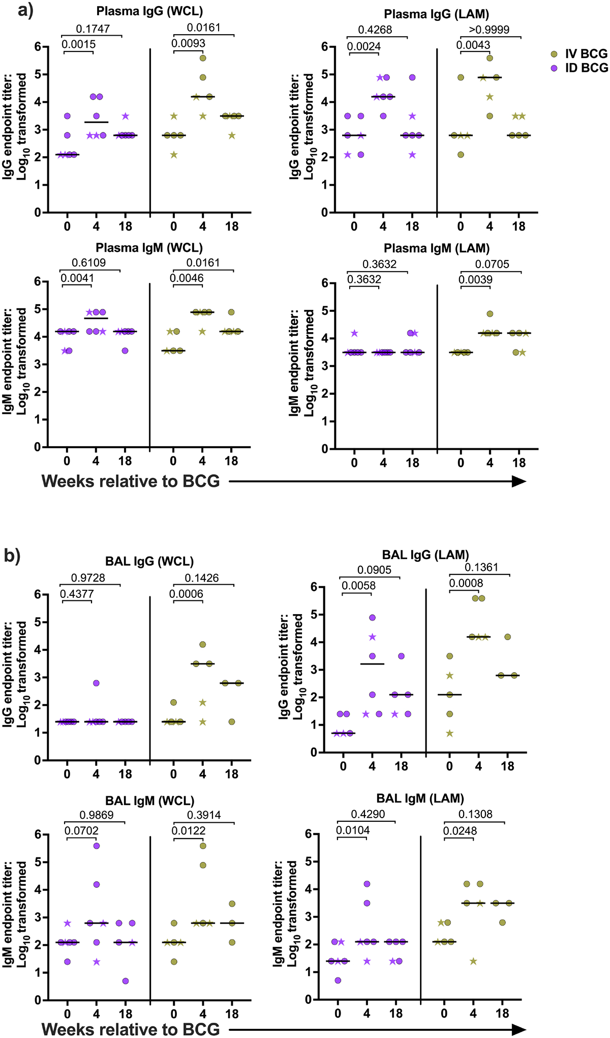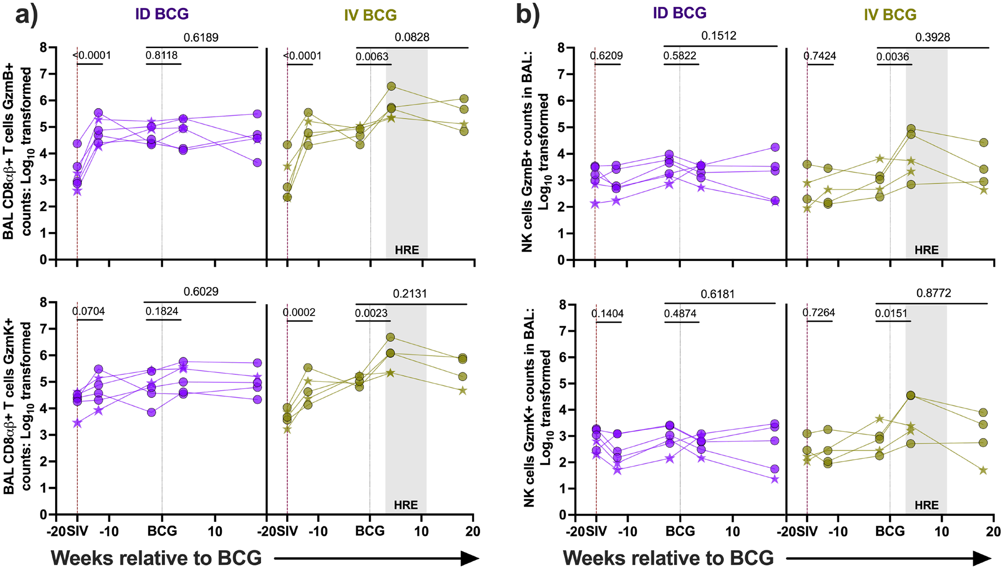 Description:Tuberculosis (TB), caused by Mycobacterium tuberculosis, is one of the leading causes of death due to an infectious agent. Coinfection with HIV exacerbates M. tuberculosis infection outcomes in people living with HIV. Bacillus Calmette-Guérin (BCG), the only approved TB vaccine, is effective in infants, but its efficacy in adolescents and adults is limited. In this study, we investigated the immune responses elicited by BCG administered via i.v. or intradermal (i.d.) routes in SIV-infected Mauritian cynomolgus macaques (MCM) without the confounding effects of M. tuberculosis challenge. We assessed the impact of vaccination on T cell responses in the airway, blood, and tissues (lung, thoracic lymph nodes, and spleen), as well as the expression of cytokines, cytotoxic effectors, and key transcription factors. Our results showed that i.v. BCG induces a robust and sustained immune response, including tissue-resident memory T cells in lungs, polyfunctional CD4+ and CD8αβ+ T cells expressing multiple cytokines, and CD8αβ+ T cells and NK cells expressing cytotoxic effectors in airways. We also detected higher levels of mycobacteria-specific IgG and IgM in the airways of i.v. BCG-vaccinated MCM. Although i.v. BCG vaccination resulted in an influx of tissue-resident memory T cells in lungs of MCM with controlled SIV replication, MCM with high plasma SIV RNA (>105 copies/ml) typically displayed reduced T cell responses, suggesting that uncontrolled SIV or HIV replication would have a detrimental effect on i.v. BCG-induced protection against M. tuberculosis.
