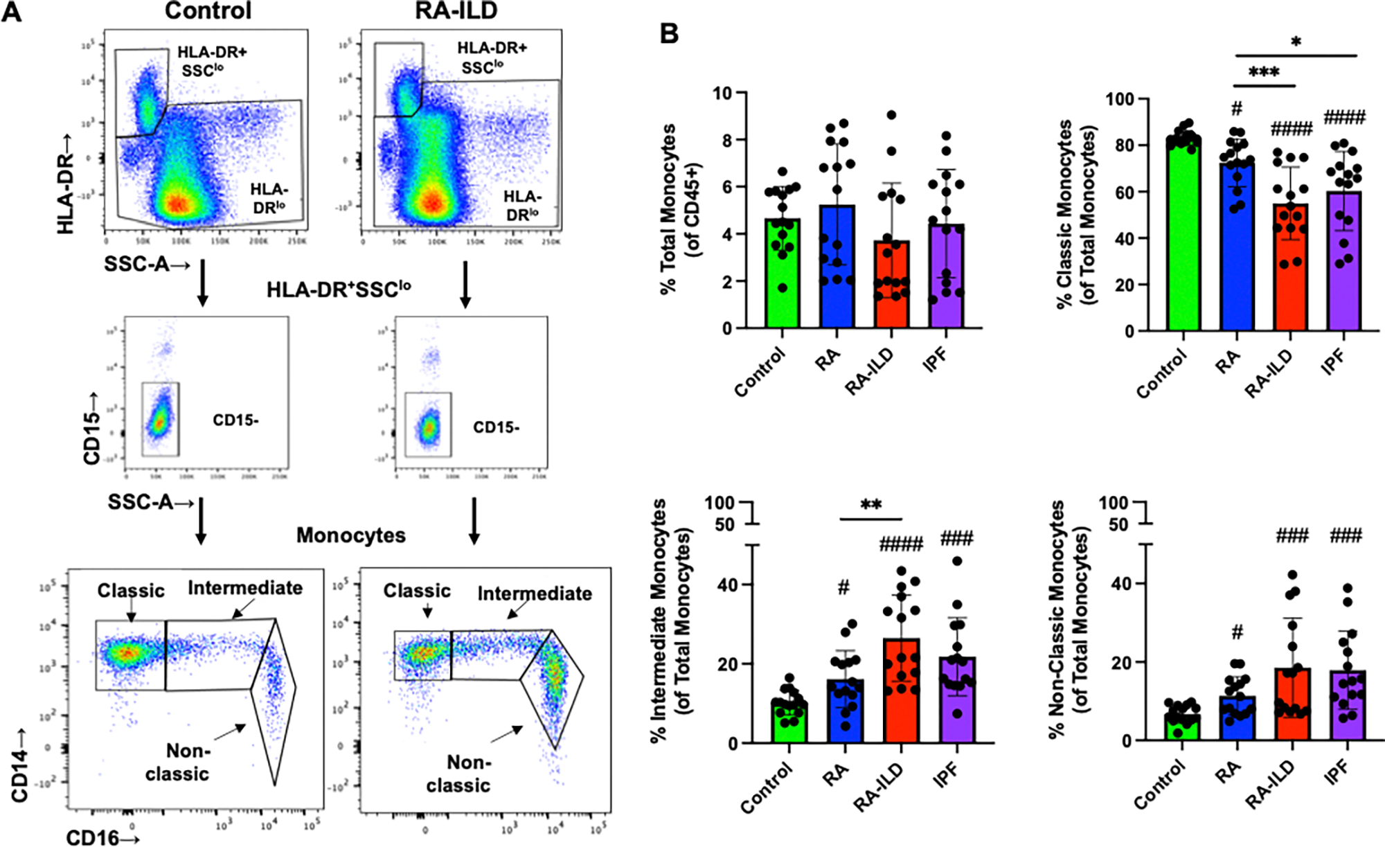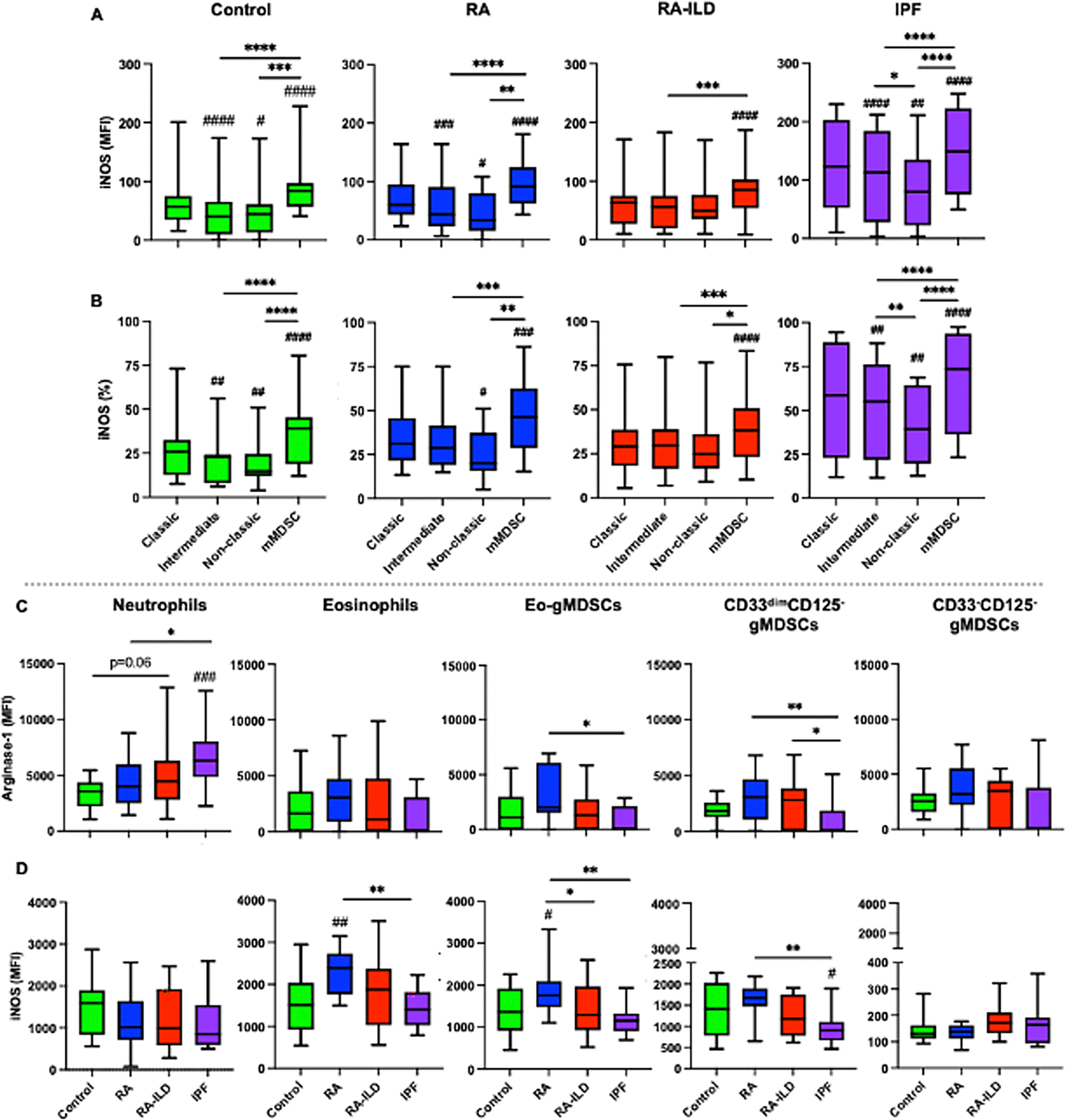 There was increased intermediate (CD14++CD16+) and nonclassical (CD14+/−CD16++) and decreased classical (CD14++CD16−) monocytes in RA, RA-ILD, and IPF vs. control. Intermediate monocytes were higher and classical monocytes were lower in RA-ILD vs. RA but not IPF. Monocytic (m)MDSCs were higher in RA-ILD vs. control and RA but not IPF. Granulocytic (g)MDSCs did not significantly differ. In contrast, neutrophils were increased in IPF and RA-ILD patients with elevated expression of arginase-1 (Arg-1) sharing similar dimensional clustering pattern. Eosinophils were increased in RA-ILD vs. controls, RA and IPF. Across cohorts, iNOS was decreased in intermediate/nonclassical monocytes but increased in mMDSCs vs. classical monocytes. In RA-ILD, iNOS positive mMDSCs were increased versus classic monocytes.