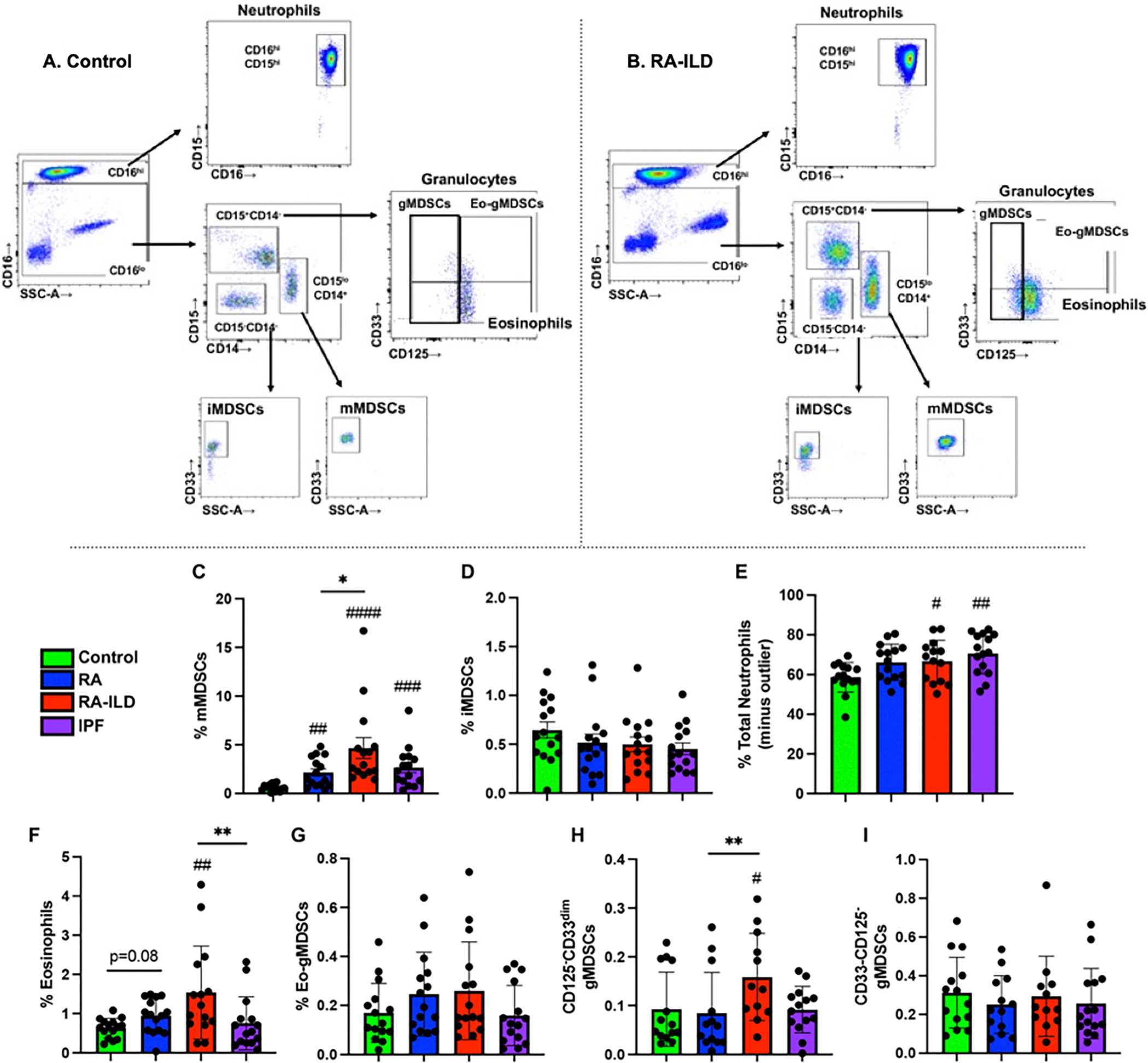 Peripheral blood was collected from patients with RA, RA-ILD, IPF, and controls (N=60, 15/cohort). Myeloid cell subpopulations were identified phenotypically by flow cytometry using the following markers:CD45,CD3,CD19,CD56,CD11b,HLA-DR,CD14,CD16, CD15,CD125,CD33. Functionality of subsets identified with intracellular arginase-1 and inducible nitric oxide synthase (iNOS) expression.