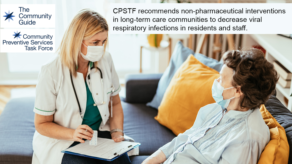 Description:The Community Preventive Services Task Force (CPSTF) findings and recommendations for "Public Health Emergency Preparedness and Response: Non-Pharmaceutical Interventions to Reduce Transmission of Viral Respiratory Infections in Long-Term Care Communities" are based on systematic reviews of evidence of effectiveness and economic impact. All CPSTF findings and recommendations were originally published in The Community Guide.