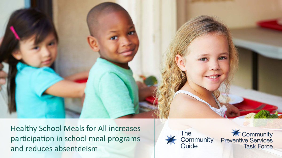 Description:The Community Preventive Services Task Force (CPSTF) findings and recommendations for "Social Determinants of Health: Healthy School Meals for All" are based on systematic reviews of evidence of effectiveness and economic impact. All CPSTF findings and recommendations were originally published in The Community Guide.