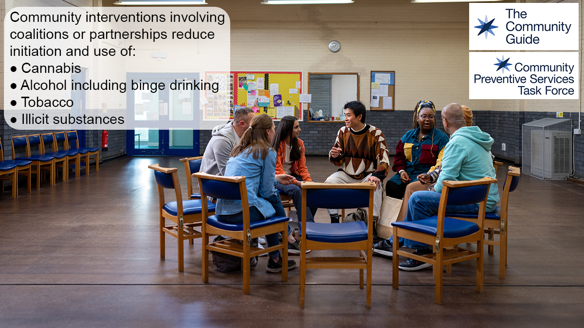 Description:The Community Preventive Services Task Force (CPSTF) findings and recommendations for "Substance Use: Community Interventions involving Coalitions or Partnerships to Prevent Substance Use among Youth " are based on systematic reviews of evidence of effectiveness and economic impact. All CPSTF findings and recommendations were originally published in The Community Guide.