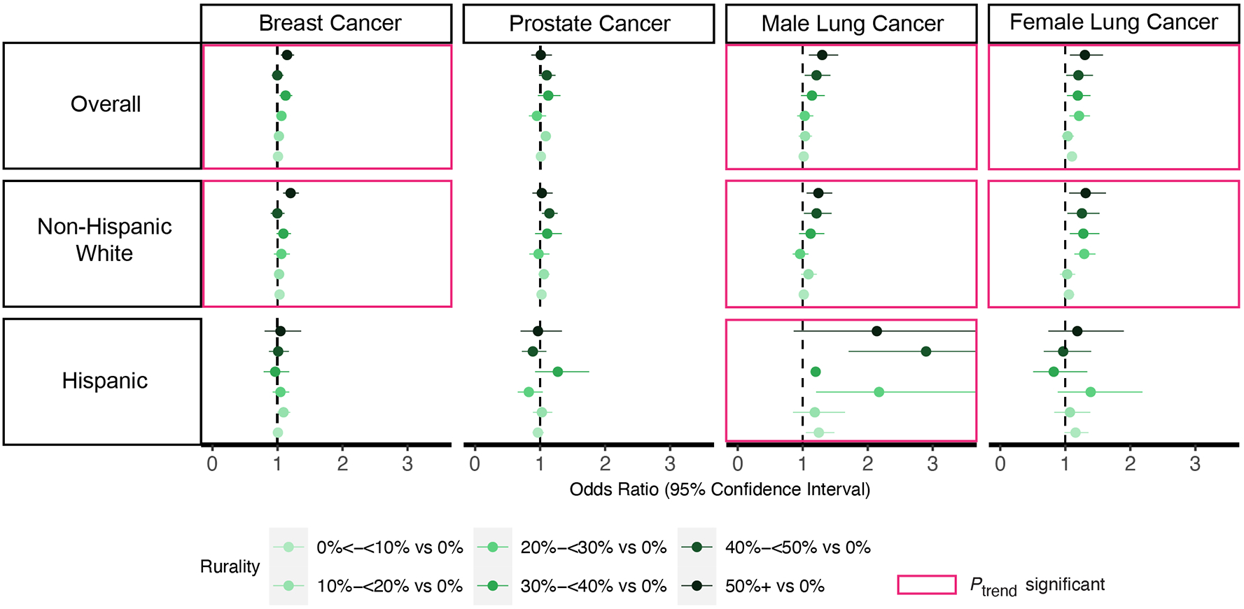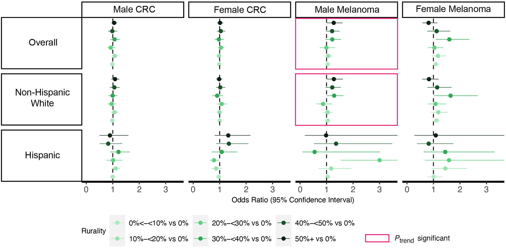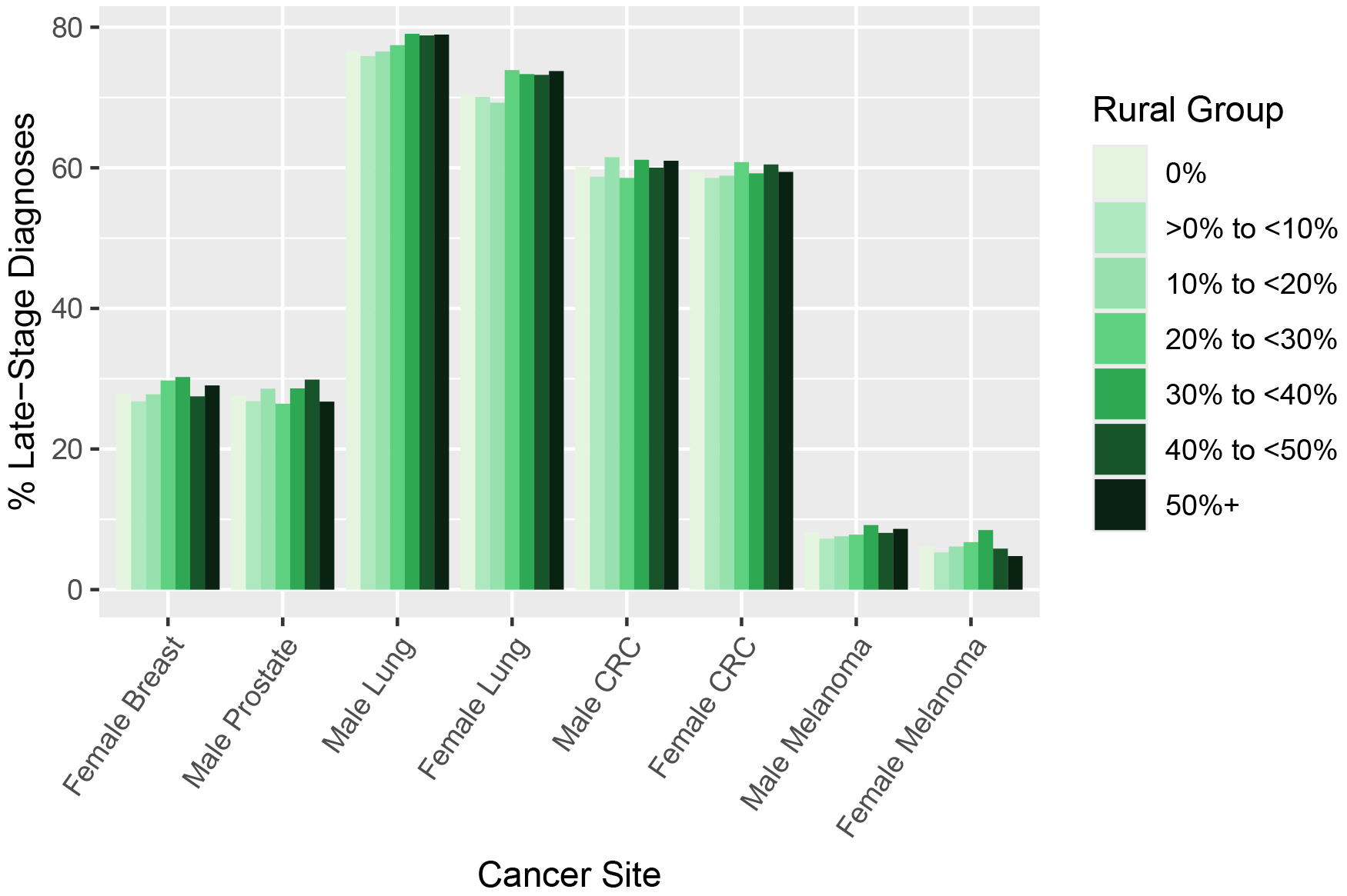 Percent of late-stage cancer diagnosis was 28% for female breast, 27% for prostate, 77% for male lung, 71% for female lung, 60% for male colorectal, 59% for female colorectal, 7.8% for male melanoma, and 5.9% for female melanoma. Increasing rurality was significantly associated with increased odds of late-stage cancer diagnosis for female breast cancer (p-trend<0.001), male lung cancer (p-trend<0.001), female lung cancer (p-trend<0.001), and male melanoma (p-trend=0.01), after adjusting for individual-level and zone-level factors. Strength of associations varied by sex and ethnicity. For males with lung cancer, odds of late-stage diagnosis in areas with >50% rural population was 1.24 (95% CI (1.06-1.45)) for non-Hispanic White patients and 2.14 (95% CI (0.86-5.31)) for Hispanic patients, compared to areas with 0% rural residents.
