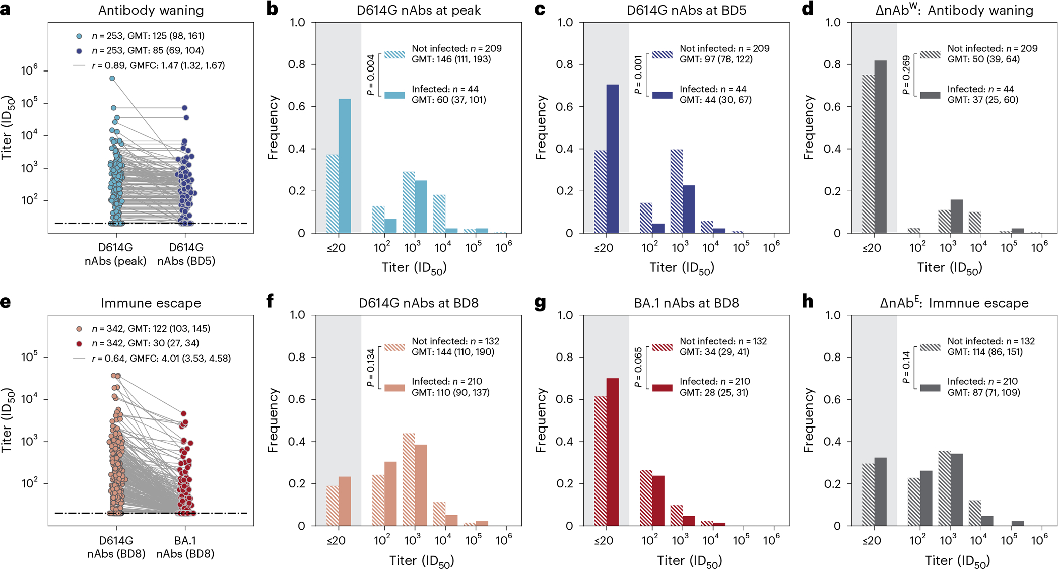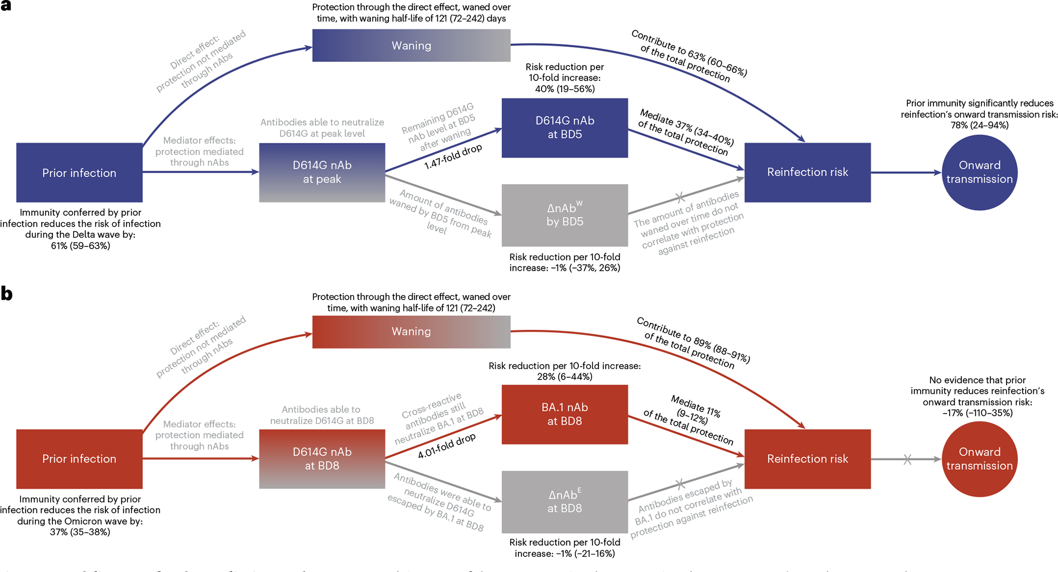 Description:Serum neutralizing antibodies (nAbs) induced by vaccination have been linked to protection against symptomatic and severe coronavirus disease 2019. However, much less is known about the efficacy of nAbs in preventing the acquisition of infection, especially in the context of natural immunity and against severe acute respiratory syndrome coronavirus 2 (SARS-CoV-2) immune-escape variants. Here we conducted mediation analysis to assess serum nAbs induced by prior SARS-CoV-2 infections as potential correlates of protection against Delta and Omicron infections, in rural and urban household cohorts in South Africa. We find that, in the Delta wave, D614G nAbs mediate 37% (95% confidence interval: 34-40%) of the total protection against infection conferred by prior exposure to SARS-CoV-2, and that protection decreases with waning immunity. In contrast, Omicron BA.1 nAbs mediate 11% (95% confidence interval: 9-12%) of the total protection against Omicron BA.1 or BA.2 infections, due to Omicron's neutralization escape. These findings underscore that correlates of protection mediated through nAbs are variant specific, and that boosting of nAbs against circulating variants might restore or confer immune protection lost due to nAb waning and/or immune escape. However, the majority of immune protection against SARS-CoV-2 conferred by natural infection cannot be fully explained by serum nAbs alone. Measuring these and other immune markers including T cell responses, both in the serum and in other compartments such as the nasal mucosa, may be required to comprehensively understand and predict immune protection against SARS-CoV-2.