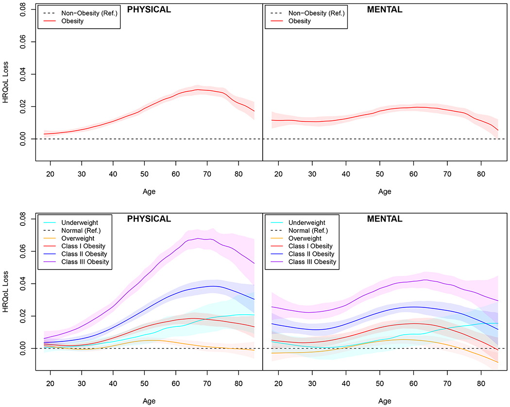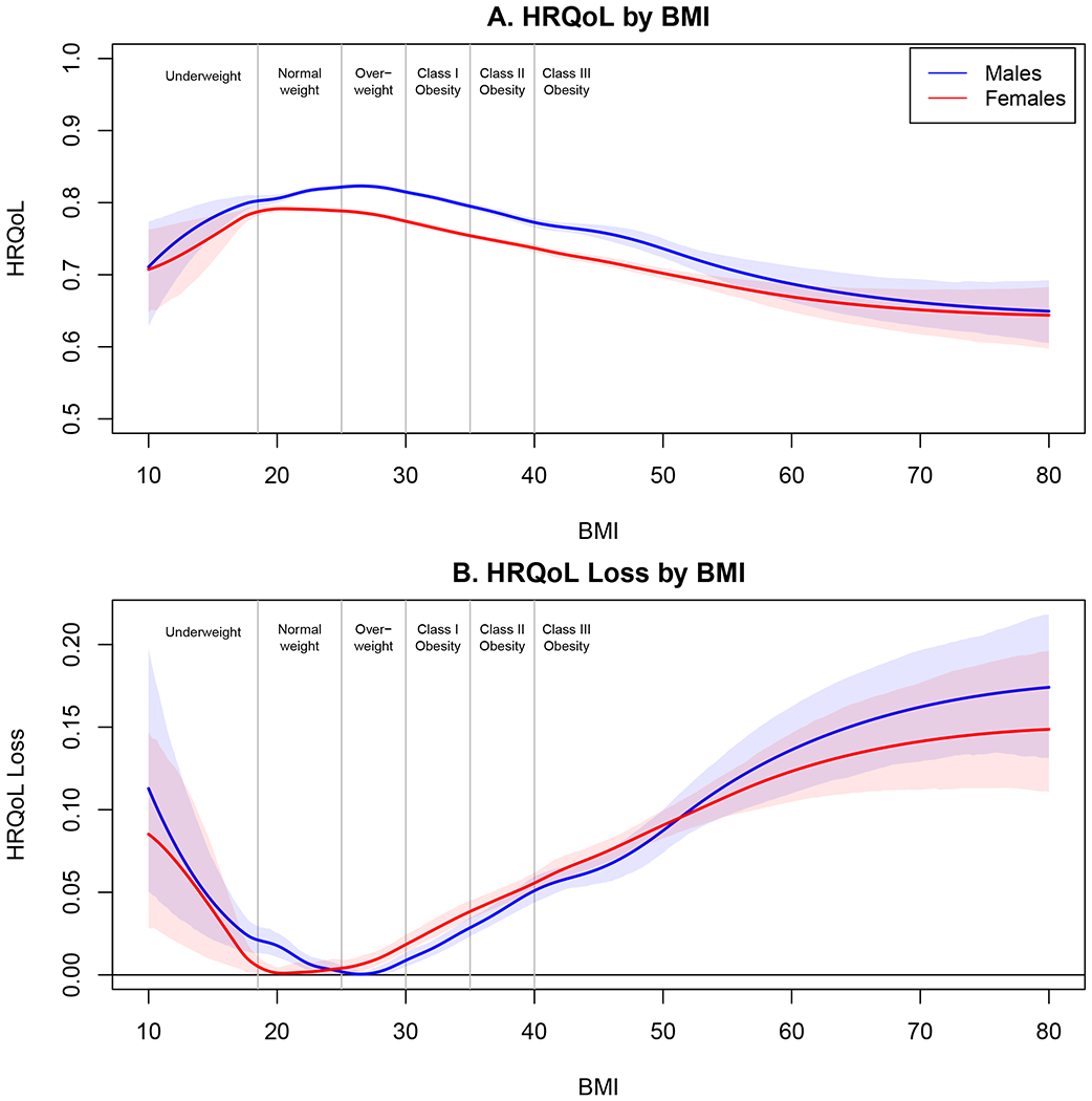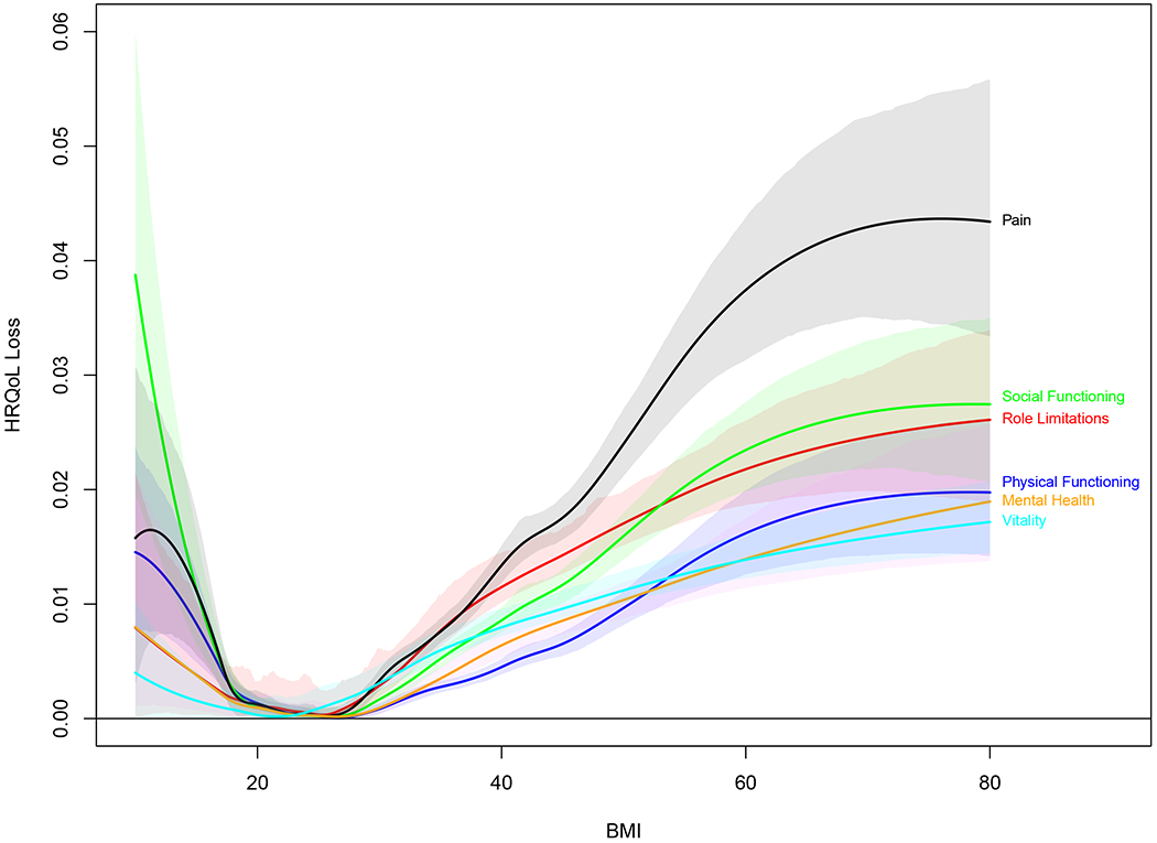 We found an inverse J-shaped curve of HRQoL by BMI, with lower values for females and the highest utilities occurring at a BMI of 20.4 (95% CI 20.32-20.48) for females and 26.5 (95% CI 26.45-26.55) for males. By BMI category, excess weight contributed to HRQoL utility loss of 0.0349 for obesity overall, rising to 0.0724 for Class III obesity. By domain, Pain was the largest cause of HRQoL loss for obesity (26%), followed by Role Limitations (22%).