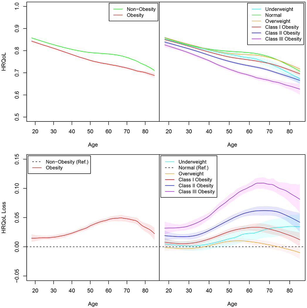 Health-related quality of life is lower for people with excess body weight across a broad range of ages and BMI levels, especially at high levels of BMI, with Pain the largest driver of HRQoL loss. These findings highlight the importance of promoting a healthy weight for the entire population while also targeting efforts to prevent extreme weight gain over the life course.