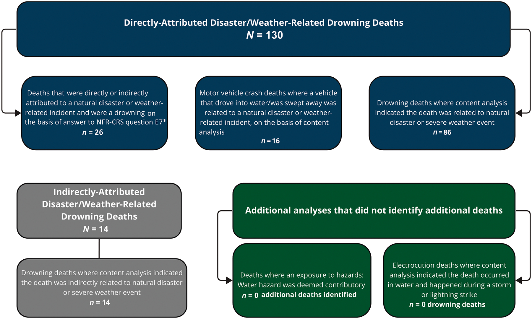 Using data entered in 2005 to 2021 for children ages 0 to 17 years from the National Fatality Review-Case Reporting System, we identified 130 drowning deaths directly attributed to natural disaster or weather incidents, and 14 deaths indirectly attributed to these incidents. Frequencies, proportions, and χ2 statistics were used to describe selected measures and compare with other drowning deaths.