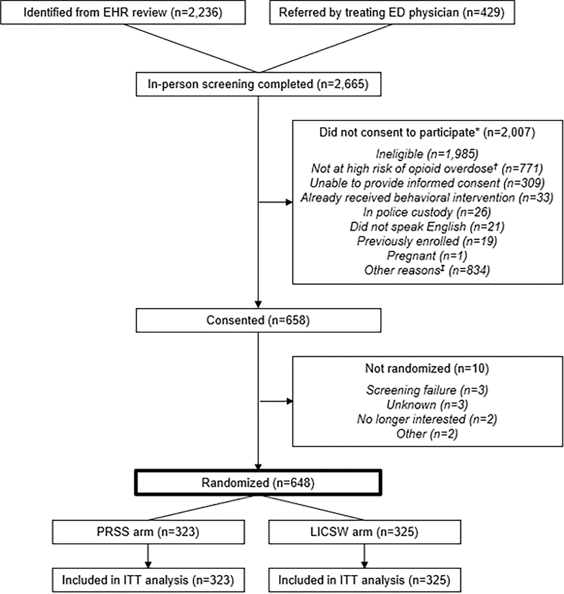 ED patients presenting with an opioid overdose, complications of opioid use disorder, or a recent history of opioid overdose (November 2018-May 2021). Among 648 participants, the mean age was 36.9 years, 68.2% were male, and 68.5% were White.