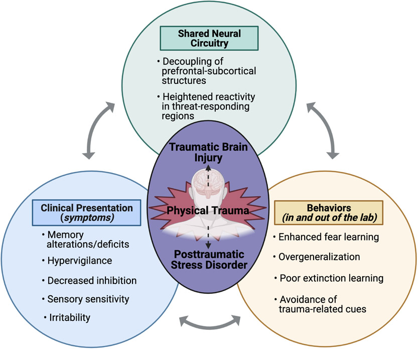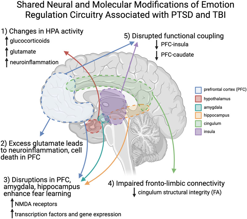 Description:The psychological trauma associated with events resulting in traumatic brain injury (TBI) is an important and frequently overlooked factor that may impede brain recovery and worsen mental health following TBI. Indeed, individuals with comorbid posttraumatic stress disorder (PTSD) and TBI have significantly poorer clinical outcomes than individuals with a sole diagnosis. Emotion dysregulation is a common factor leading to poor cognitive and affective outcomes following TBI. Here, we synthesize how acute postinjury molecular processes stemming from either physical or emotional trauma may adversely impact circuitry subserving emotion regulation and ultimately yield long-term system-level functional and structural changes that are common to TBI and PTSD. In the immediate aftermath of traumatic injury, glucocorticoids stimulate excess glutamatergic activity, particularly in prefrontal cortex-subcortical circuitry implicated in emotion regulation. In human neuroimaging work, assessing this same circuitry well after the acute injury, TBI and PTSD show similar impacts on prefrontal and subcortical connectivity and activation. These neural profiles indicate that emotion regulation may be a useful target for treatment and early intervention to prevent the adverse sequelae of TBI. Ultimately, the success of future TBI and PTSD early interventions depends on the fields' ability to address both the physical and emotional impact of physical injury.