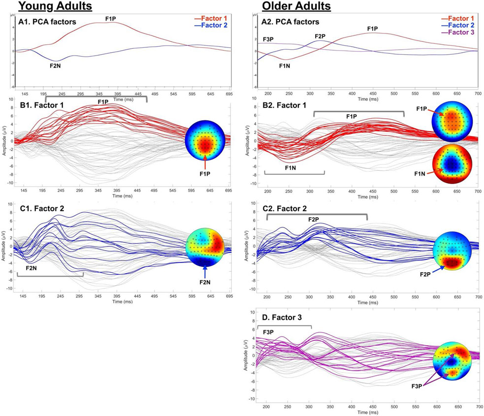 Description:Aging is accompanied by frontal lobe and non-dominant hemisphere recruitment that supports executive functioning, such as inhibitory control, which is crucial to all cognitive functions. However, the spatio-temporal sequence of processing underlying successful inhibition and how it changes with age is understudied. Thus, we capitalized on the temporal precision of event-related potentials (ERPs) to assess the functional lateralization of N200 (conflict monitoring) and P300 (inhibitory performance evaluation) in young and healthy older adults during comparably performed successful stop-signal inhibition. We additionally used temporal principal components analysis (PCA) to further interrogate the continuous spatio-temporal dynamics underlying N200 and P300 activation for each group. Young adults demonstrated left hemisphere-dominant N200, while older adults demonstrated overall larger amplitudes and right hemisphere dominance. N200 activation was explained by a single PCA factor in both age groups, but with a more anterior scalp distribution in older adults. The P300 amplitudes were larger in the right hemisphere in young, but bilateral in old, with old larger than young in the left hemisphere. P300 was also explained by a single factor in young adults but by two factors in older adults, including distinct parieto-occipital and anterior activation. These findings highlight the differential functional asymmetries of conflict monitoring (N200) and inhibitory evaluation and adaptation (P300) processes and further illuminate unique age-related spatio-temporal recruitment patterns. Older adults demonstrated lateralized recruitment during conflict processing and bilateral recruitment during evaluation and adaptation, with anterior recruitment common to both processes. These fine-grained analyses are critically important for more precise understanding of age-related compensatory activation.
