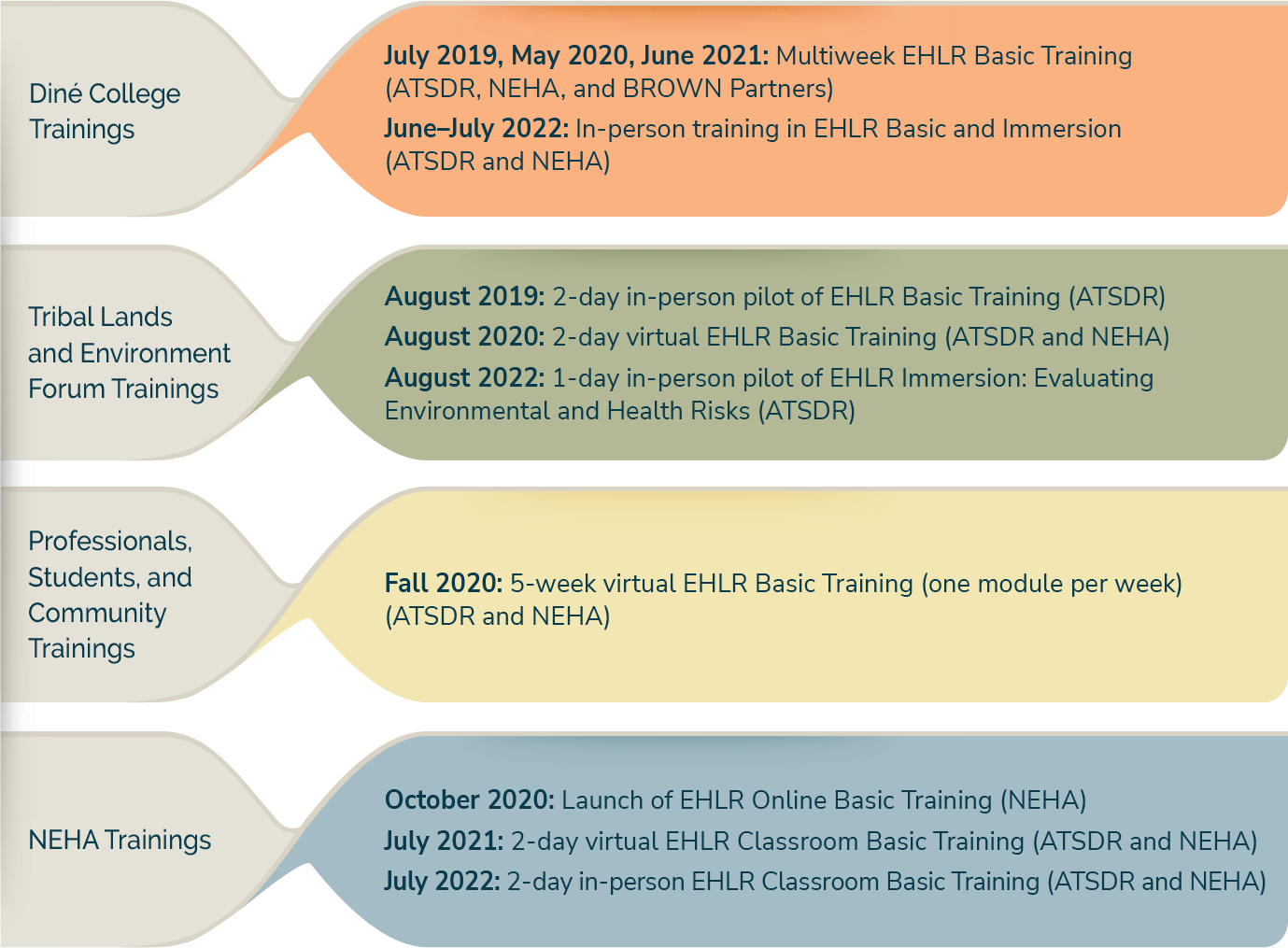 Description:This article is the first in a series of three that describes the development and delivery of the Environmental Health and Land Reuse (EHLR) Basic Training and the first pilot of the EHLR Immersion Training. The EHLR Basic Training is based on the 5-step Land Reuse Model from the Agency for Toxic Substances and Disease Registry (ATSDR). Through a collaboration with the National Environmental Health Association (NEHA), we developed the EHLR Basic Training in two modalities: virtual/live (maintained by ATSDR) and online/asynchronous (maintained by NEHA). The modules include: 1) Engaging With Your Community, 2) Evaluating Environmental and Health Risks, 3) Communicating Environmental and Health Risks, 4) Redesigning With Health in Mind, and 5) Measuring Success: Evaluating Environmental and Health Change. From June 2019-August 2022, ATSDR and NEHA delivered 10 EHLR Classroom Basic Trainings, launched the EHLR Online Basic Training, and developed the EHLR Immersion Training. We piloted the EHLR Immersion Training in July 2022, March 2023, and July 2023. Our participants included science, technology, engineering, and mathematics (STEM) students from Diné College who were in a Summer Intern Program; tribal environmental professionals; NEHA members in environmental health careers; and environmental professionals, students, and community members who were engaged in environmental work or environmental justice. We have learned that individual training modules can be used for specific learning needs among our participants. Perhaps more importantly, we have learned that undergraduate students and community members can and should be engaged in EHLR Training. The results of the evaluation and long-term follow-up of the EHLR Training will be presented in the second and third articles in this series.