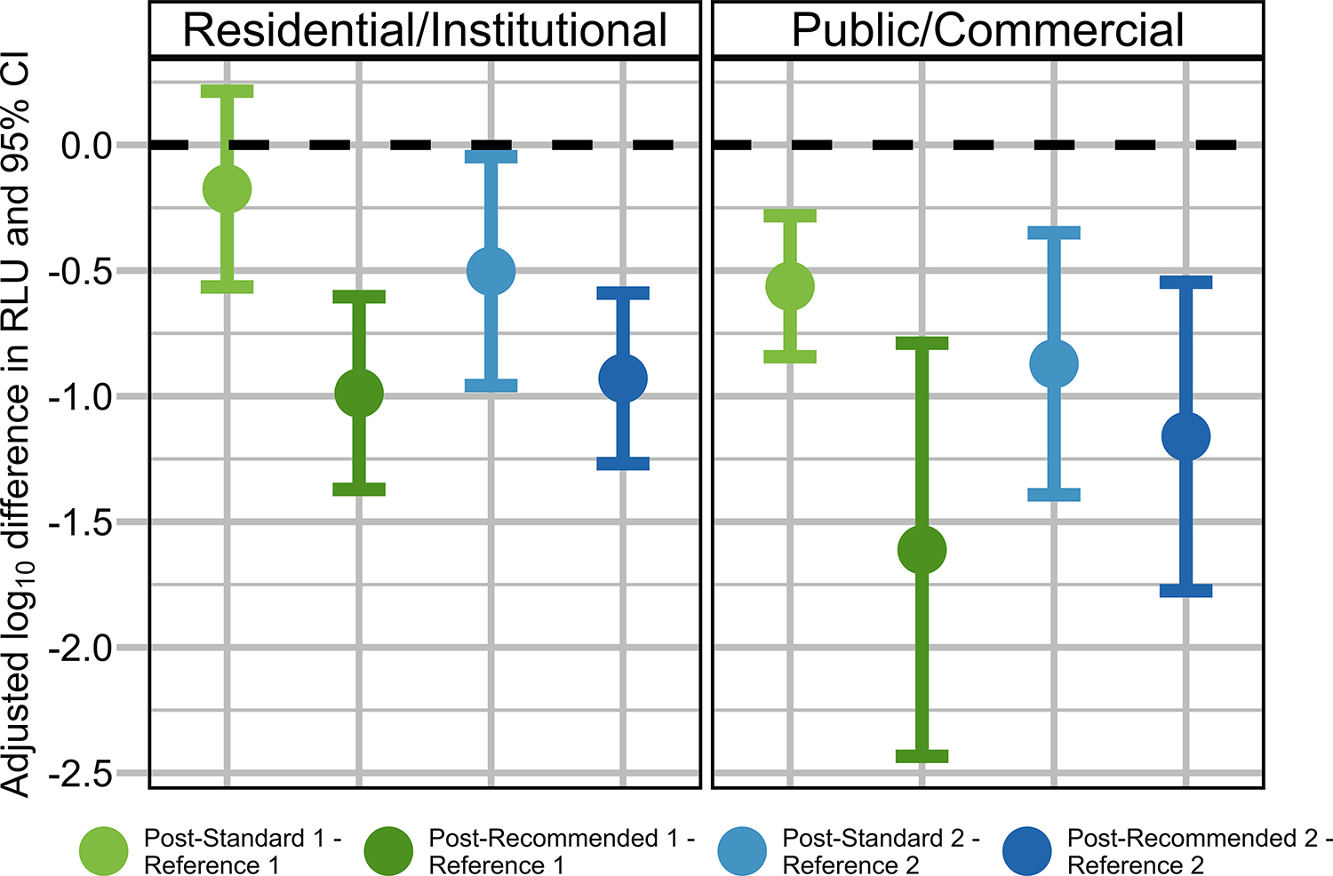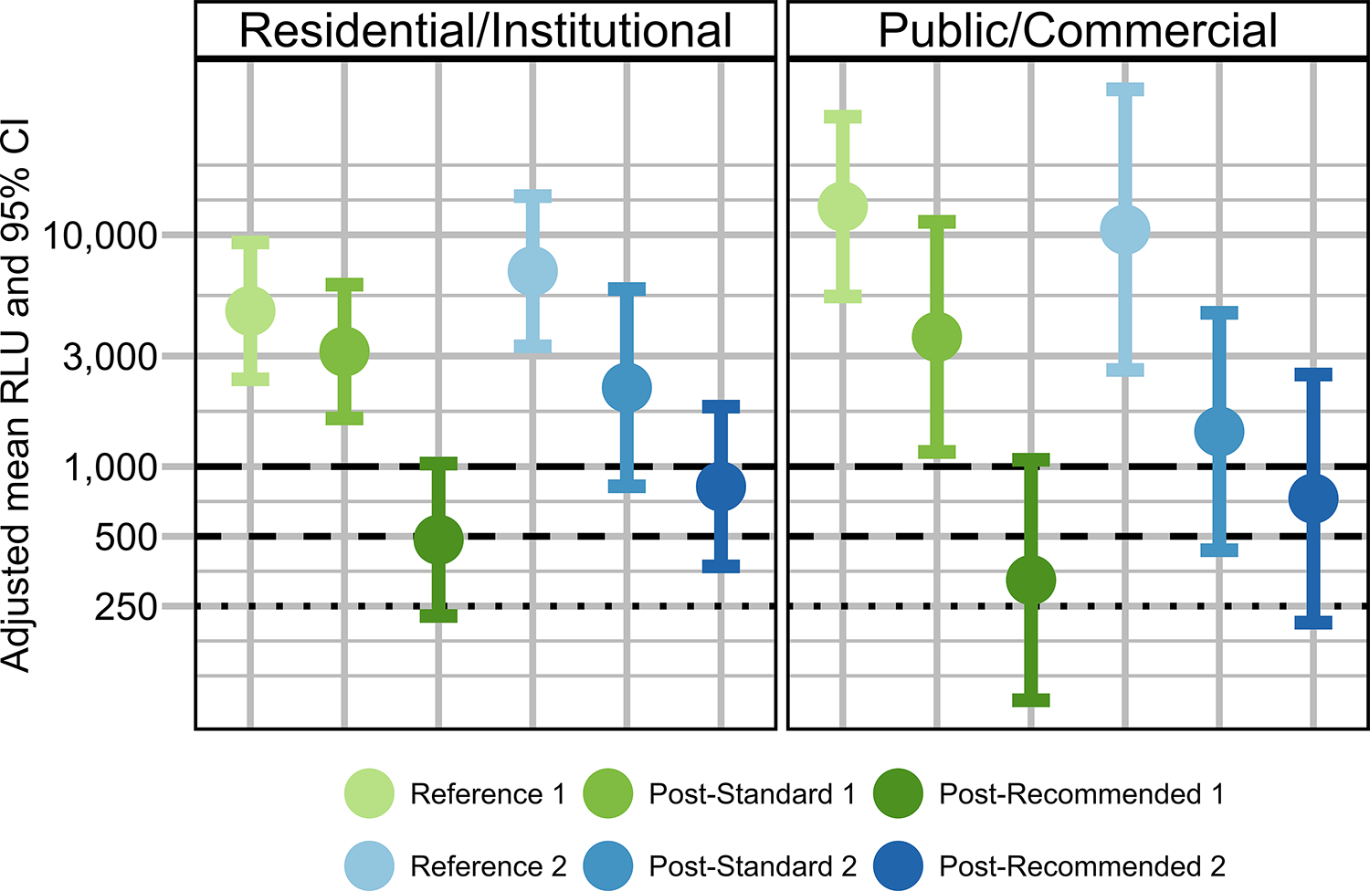 Description:Quality improvements and reduction of disease risk for low-resource shared sanitation facilities require cleanliness assessment approaches that are both rigorous and practical. Using Adenosine Triphosphate (ATP) bioluminescence testing, we assessed contamination on high-touch (HT) surfaces (inner door handles) at 32 shared toilet sites in Kisumu, Kenya. In public toilets, contamination was lowest after cleaning and disinfection (C&D) with 0.5% chlorine solution (adjusted difference in mean log| Relative Light Units per 100cm| (aDiff): -1.61; CI: -2.43, -0.59), followed by C&D with 0.1% chlorine solution (aDiff: -1.16; CI: -1.77, -0.55). ATP levels were not associated with overall observable toilet cleanliness and had poor agreement with visually assessed HT surface cleanliness. Our findings demonstrate the utility of this field-feasible method for detecting the impact of recent C&D in low-resource shared toilets, a novel setting for ATP cleanliness testing, while also highlighting the importance of using effective C&D procedures and addressing HT surfaces within cleaning protocols.