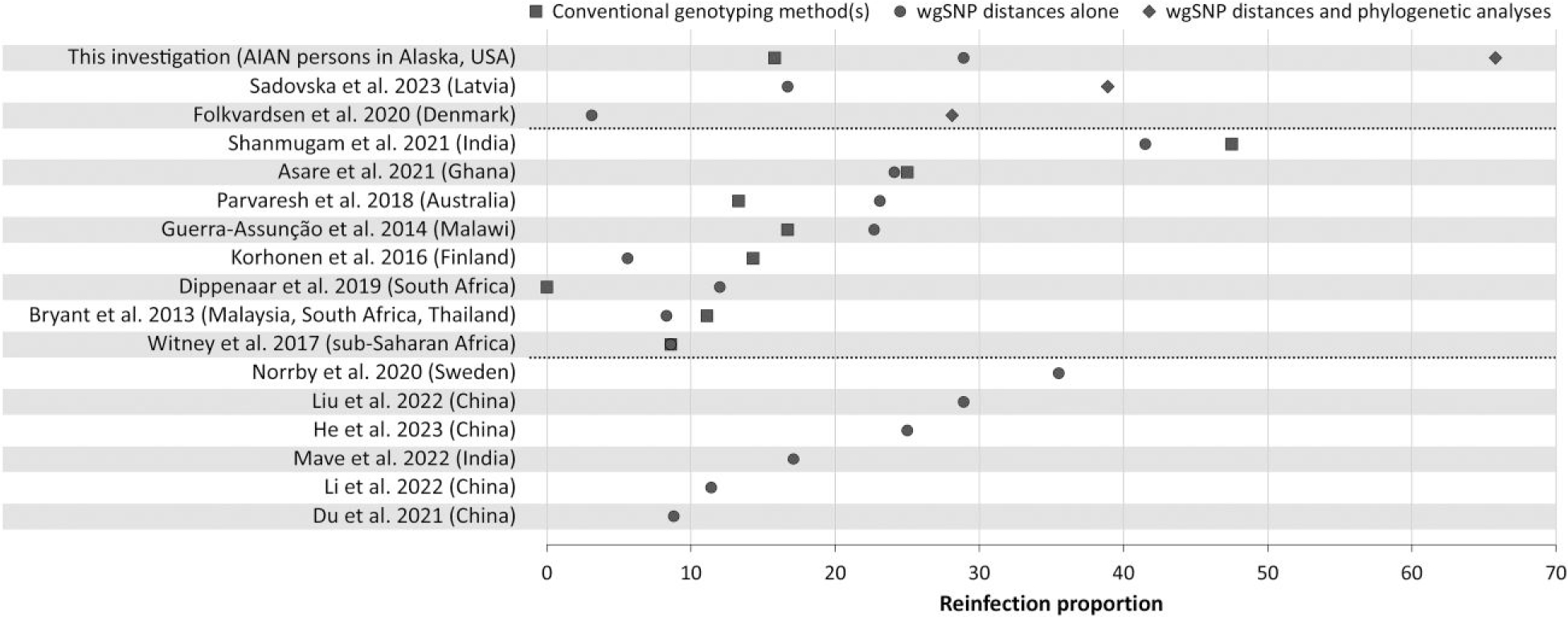 The percentage of tuberculosis cases in AIAN persons in Alaska classified as recurrent episodes (11.8%) was 3 times the national percentage (3.9%). Of 38 recurrent episodes included in genetic analyses, we attributed 25 (65.8%) to reinfection based on wgSNP distances and phylogenetic analyses; this proportion was the highest among 16 published point estimates identified through the literature search. By comparison, we attributed 11 (28.9%) and 6 (15.8%) recurrent episodes to reinfection based on wgSNP distances alone and on conventional genotyping methods, respectively.