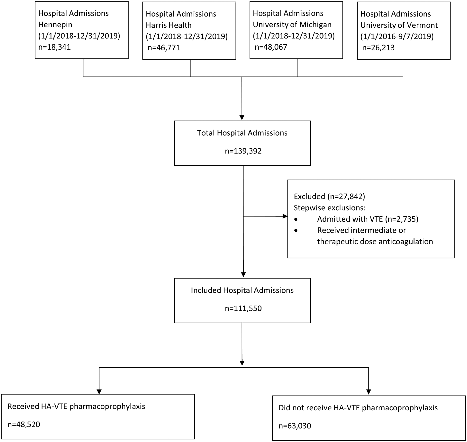 Among 111,550 admissions not on intermediate or full-dose anticoagulation, 48,520 (43.5%) received HA-VTE pharmacoprophylaxis on the day of or the day after admission.