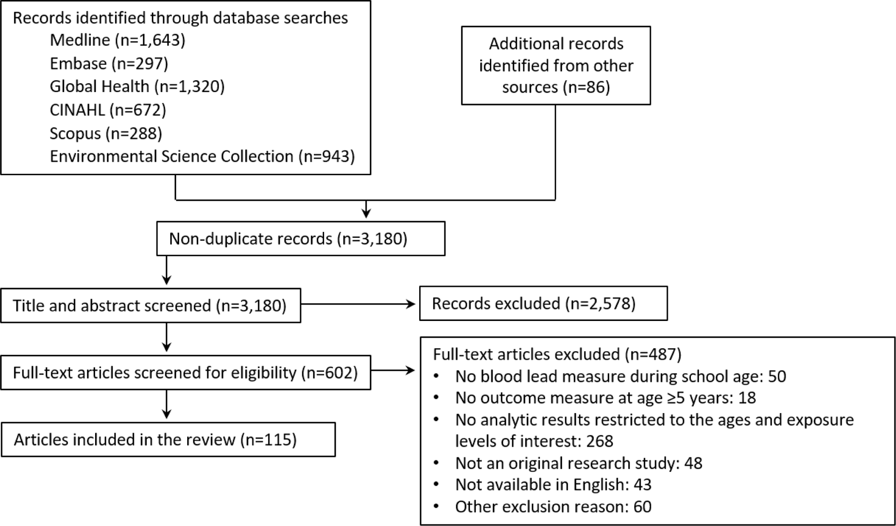 Overall, 115 of 3,180 screened articles met the inclusion criteria. The reported mean or median BLL was <5 µg/dL in 98 articles (85%). Of the included articles, 89 (77%) presented some evidence of an association between BLLs <10 µg/dL during school age and detrimental outcomes in a wide range of categories. The strongest evidence of an association was for the outcomes of intelligence quotient (IQ), and attention-deficit/hyperactivity disorder (ADHD) diagnoses or behaviors.