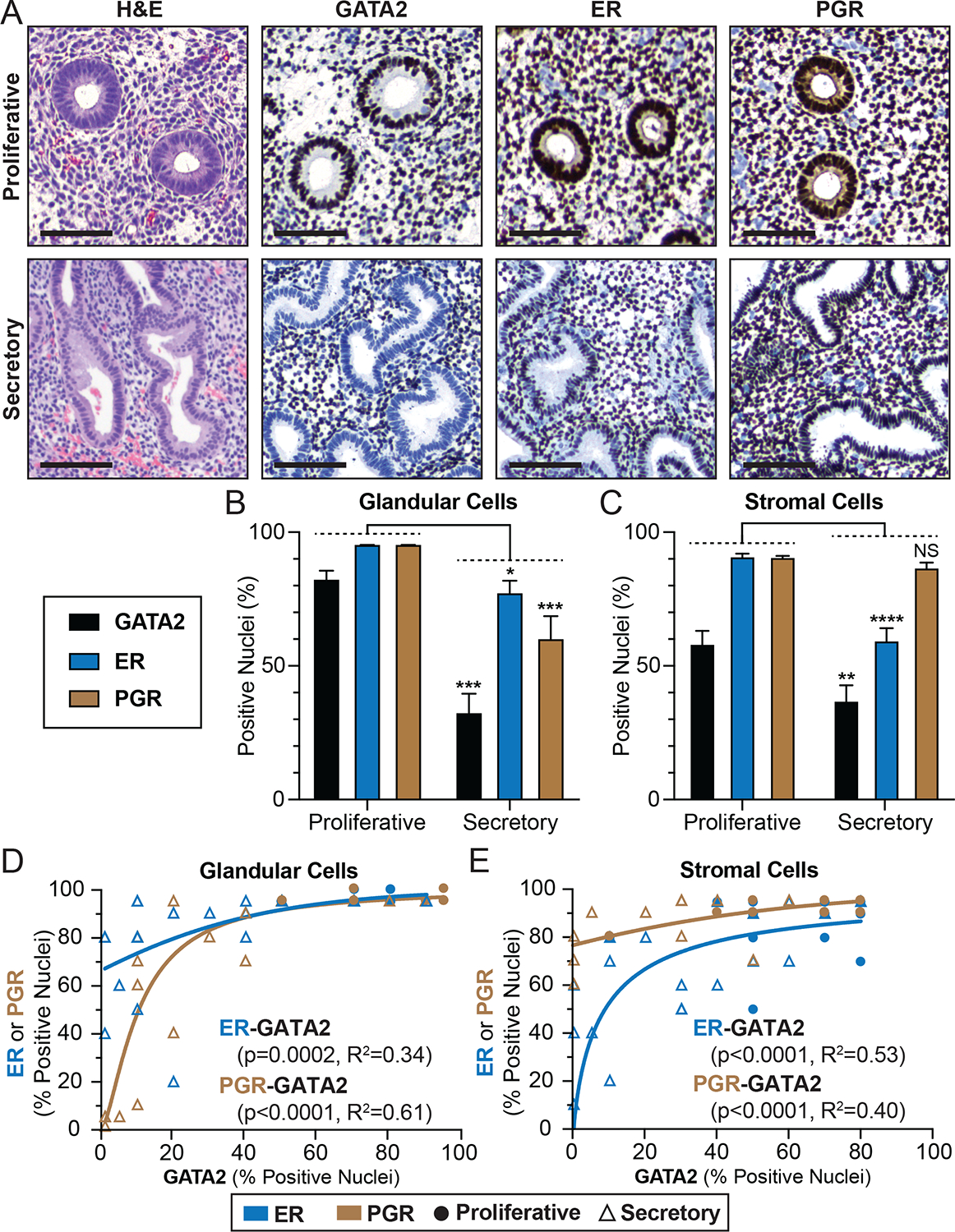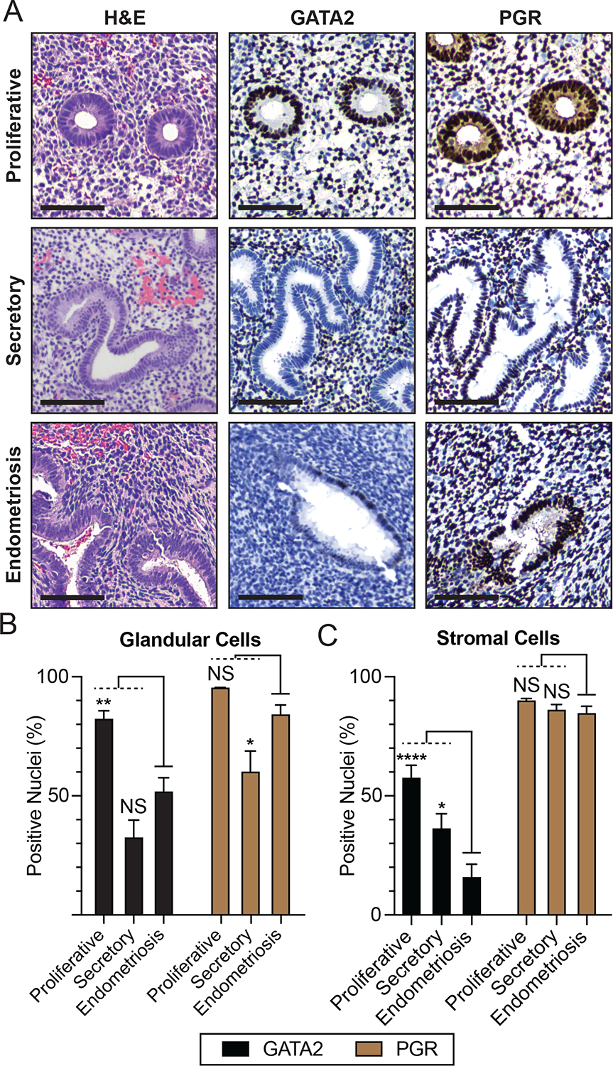 Description:The GATA gene family encodes highly conserved zinc-finger transcription factors that facilitate the development and function of multiple organ systems including the uterus. In the endometrium, GATA2 functions in a positive autoregulatory loop with the progesterone receptor (PGR) and colocalizes with PGR on chromatin to promote PGR transcriptional programs. GATA2 also has PGR-independent functions that maintain endometrial cell identity, and GATA2 transcripts reportedly are down-regulated in endometrial disorders including endometriosis. This event is accompanied by a reciprocal increase in GATA6. Here, we applied custom anti-GATA2 monoclonal antibodies and performed GATA2 immunohistochemistry (IHC) on patient endometrial tissues corresponding to proliferative, secretory, inactive, and hormone-treated endometrium, as well as endometriosis and endometrial atypical hyperplasia/endometrioid intraepithelial neoplasia (EAH/EIN). We also performed IHC for the estrogen receptor, PGR, and GATA6 in relevant groups. The results reveal a tight correlation between GATA2 and PGR expression in the glandular and stromal cells of benign endometrium. GATA2 expression is markedly reduced in stromal but not glandular cells in endometriosis and EAH/EIN. This reduction in GATA2 expression does not lead to a detectable increase in GATA6 expression in endometriosis. Although average glandular GATA2 expression was preserved in endometriosis and EAH/EIN cases, its expression was decoupled from PGR, implying that alternative pathways regulate GATA2 levels in these disorders. Our findings indicate that GATA2 dysregulation is a feature of endometriosis and EAH/EIN, and support a model whereby loss of stromal GATA2 in these disorders contributes to their progesterone insensitivity.