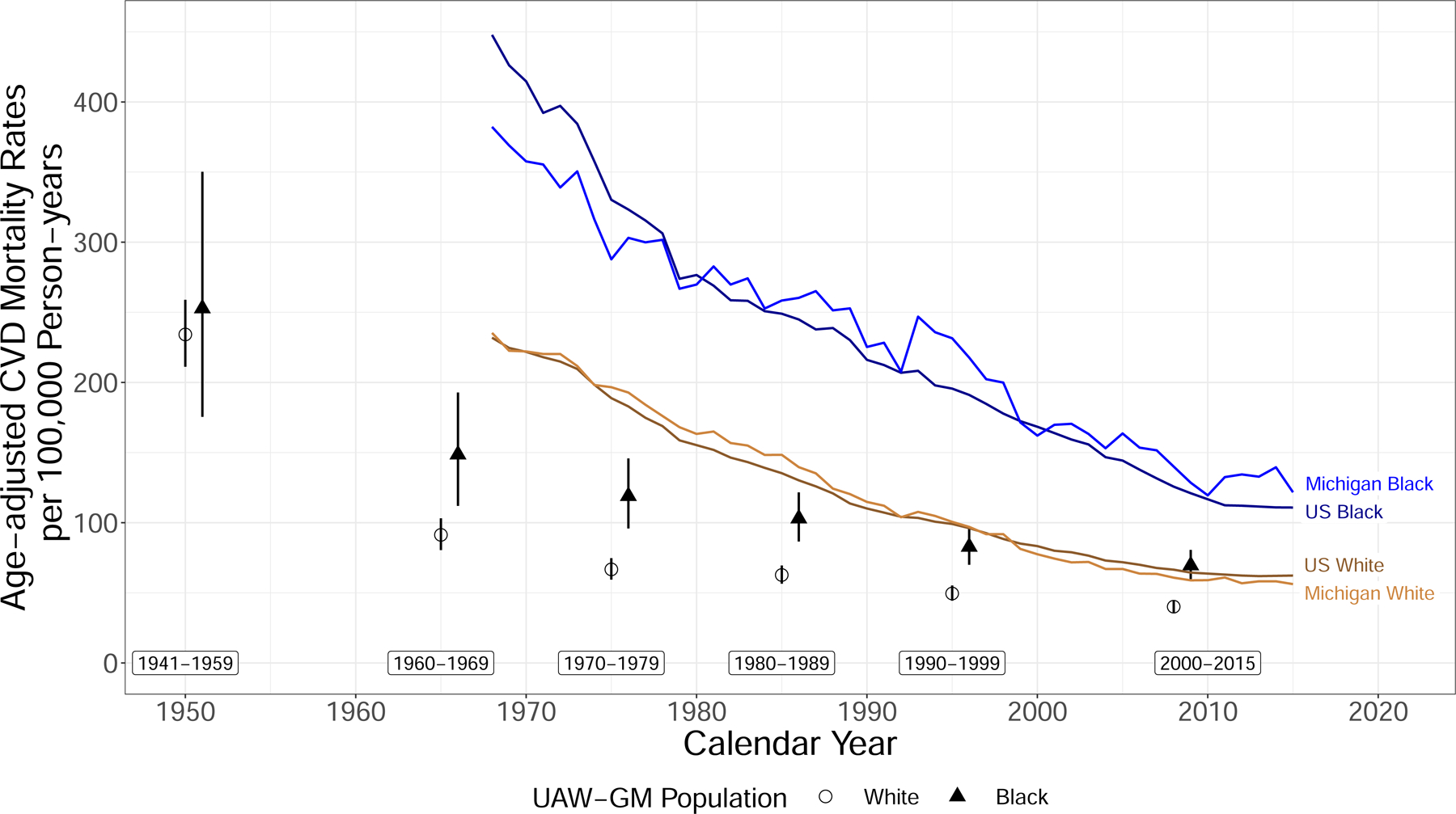 This retrospective cohort study of 39,693 hourly autoworkers from three Michigan automobile plants, includes 75 years of follow-up (1941–2015). Workforce racial diversity (percent Black autoworkers) was a plant and year level variable. Annual exposure was cumulated over each individual’s working life and divided by time since hire. This time-varying measure was categorized into low, moderate, and high. We estimated age-standardized rates of CVD and cox proportional hazards ratios (HR) by race.