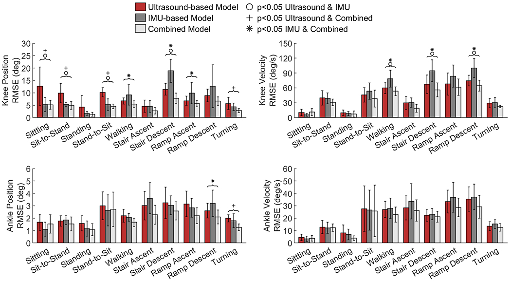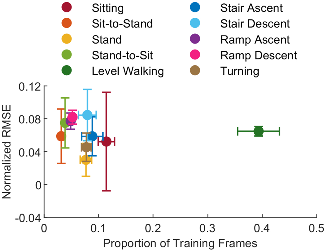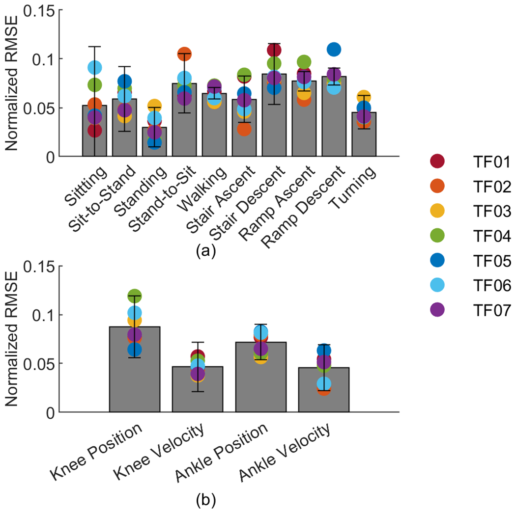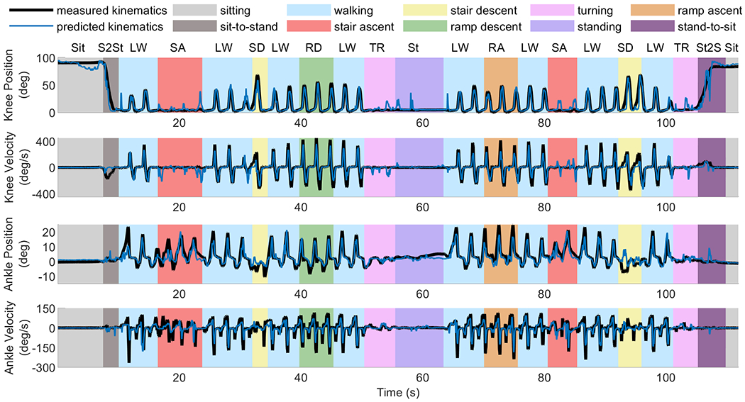 Predictions on testing ambulation circuit trials resulted in a mean normalized RMSE across different ambulation modes of 8.7 ± 3.1%, 4.6 ± 2.5%, 7.2 ± 1.8%, and 4.6 ± 2.4% for knee position, knee velocity, ankle position, and ankle velocity, respectively.