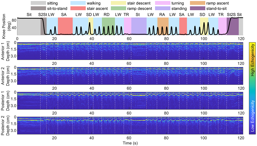 In this study, we show that a small and lightweight A-mode ultrasound system can continuously predict prosthesis joint kinematics in seven individuals with transfemoral amputation across different ambulation tasks. Features from the A-mode ultrasound signals were mapped to the user’s prosthesis kinematics via an artificial neural network.