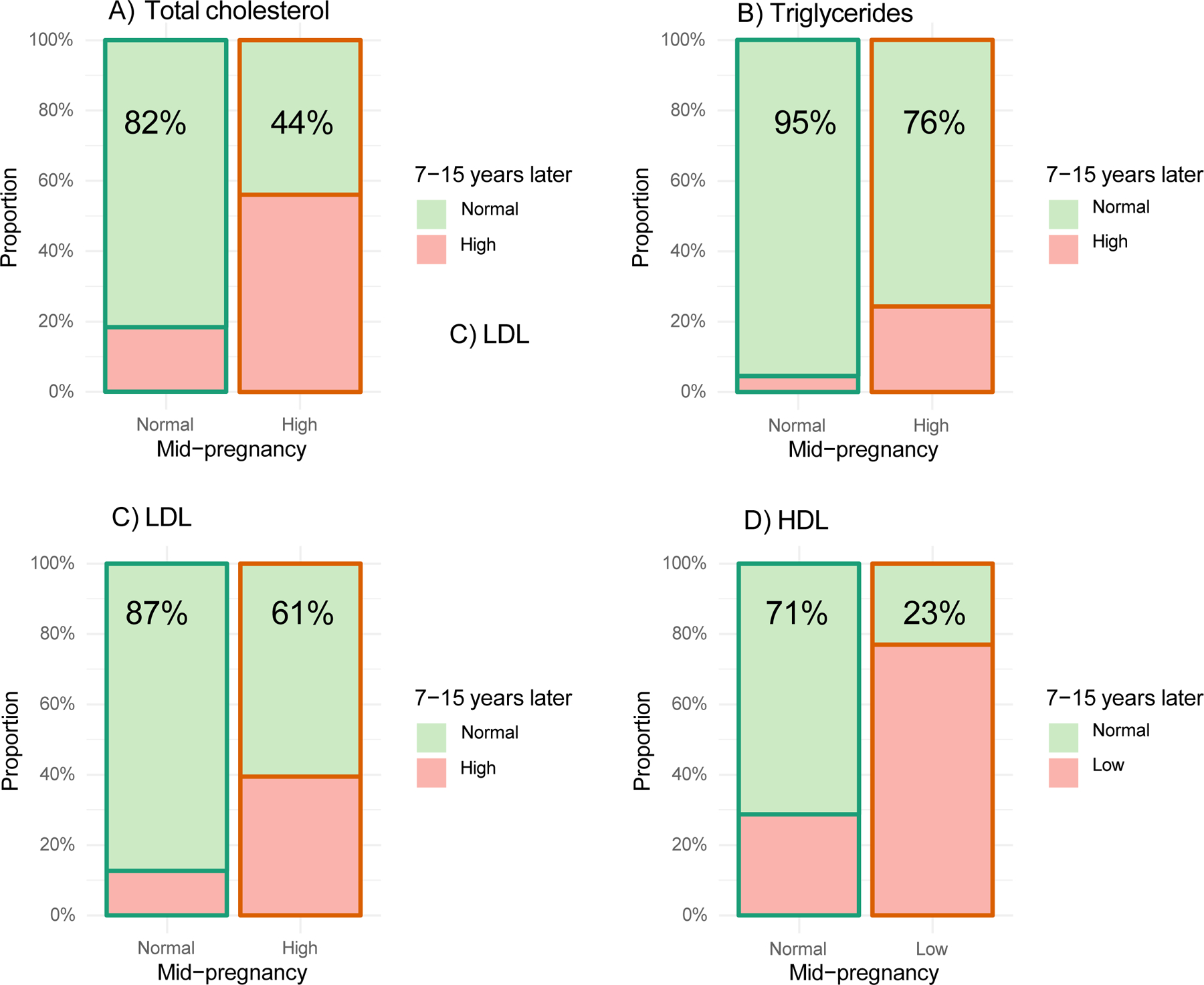 Mid-pregnancy triglycerides, LDL, and total cholesterol levels at the upper quartile were associated with at least 3-fold increase in risk of abnormal triglycerides, LDL, and total cholesterol levels later in life. Women with low mid-pregnancy HDL levels had just over a twofold increased risk of abnormally low HDL levels at follow-up. These associations persisted following adjustment for covariates, i.e. demographics, lifestyle, and years of follow-up.