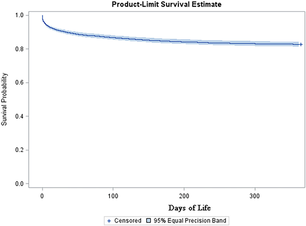 A cohort of live-born infants delivered during 1999–2017 with congenital hydrocephaly without spina bifida was identified from the Texas Birth Defects Registry. Deaths within 1 year of delivery were identified using vital and medical records. One-year infant survival estimates were generated for multiple descriptive characteristics using the Kaplan–Meier method. Crude hazard ratios (HRs) for one-year survival among infants with congenital hydrocephaly by maternal and infant characteristics and adjusted HRs for maternal race and ethnicity were estimated using Cox proportional hazard models.
