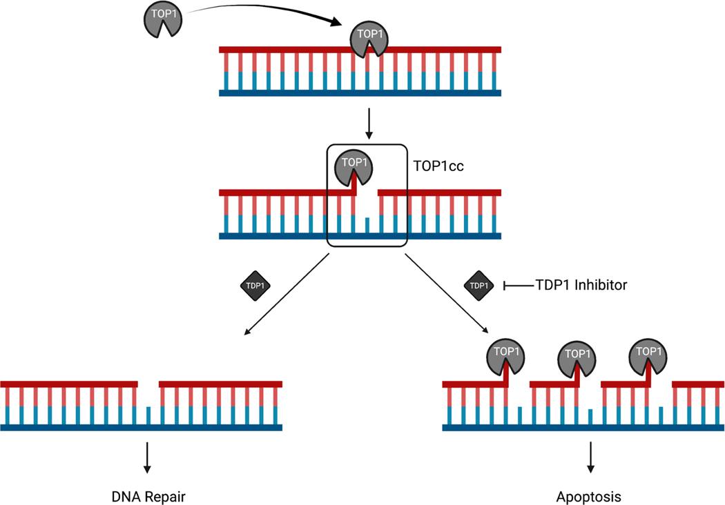 We identified 16 compounds that inhibit over 75% of GEP NEC spheroid survival. Interestingly, 7 are inhibitors of Tyrosyl-DNA phosphodiesterase 1 (TDP1), a DNA repair enzyme working closely with the topoisomerase I complex. When combined with temozolomide or doxorubicin, the TDP1 inhibitor cytarabine increased the cytotoxic effects of these drugs on NEC1452 cells which was further evidenced by increasing γH2AX and decreasing phosphorylated-ERK in combination treatment compared to temozolomide alone.