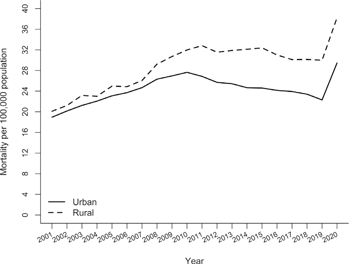 In the cross-sectional study, based on the Centers for Disease Control and Prevention WONDER (Wide-ranging ONline Data for Epidemiologic Research) Multiple Cause of Death data, age-standardized mortality with AKI as the multiple cause was obtained among adults aged ≥25 years from 2001–2020, by age, sex, race and ethnicity, stratified by urban-rural counties. Joinpoint regressions were used to assess trends from 2001–2019 in AKI-related mortality rate. Pairwise comparison was used to compare mean differences in mortality between urban and rural counties from 2001–2019.