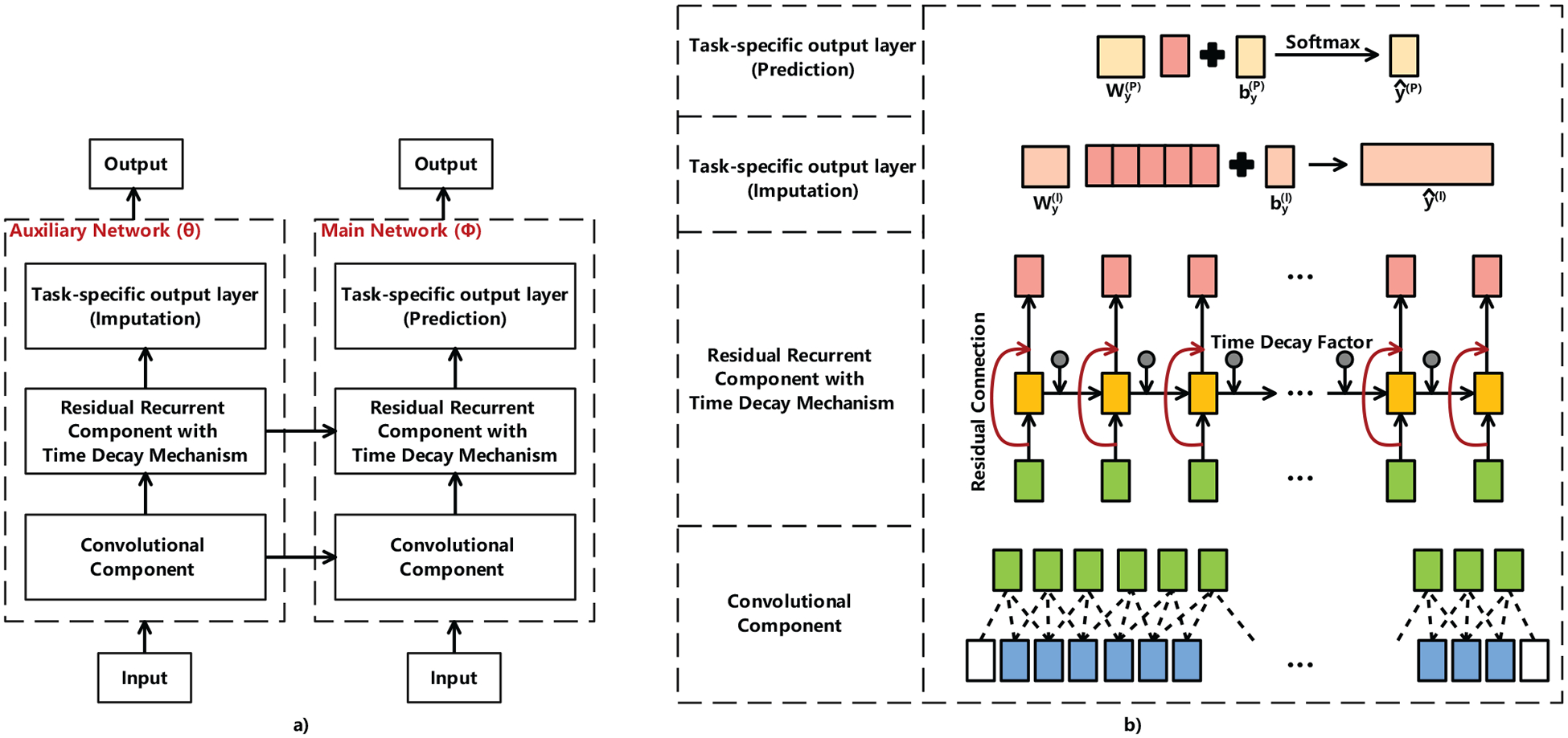 Description:Multivariate clinical time series data, such as those contained in Electronic Health Records (EHR), often exhibit high levels of irregularity, notably, many missing values and varying time intervals. Existing methods usually construct deep neural network architectures that combine recurrent neural networks and time decay mechanisms to model variable correlations, impute missing values, and capture the impact of varying time intervals. The complete data matrices thus obtained from the imputation task are used for downstream risk prediction tasks. This study aims to achieve more desirable imputation and prediction accuracy by performing both tasks simultaneously. We present a new multi-task deep neural network that incorporates the imputation task as an auxiliary task while performing risk prediction tasks. We validate the method on clinical time series imputation and in-hospital mortality prediction tasks using two publicly available EHR databases. The experimental results show that our method outperforms state-of-the-art imputation-prediction methods by significant margins. The results also empirically demonstrate that the incorporation of time decay mechanisms is a critical factor for superior imputation and prediction performance. The novel deep imputation-prediction network proposed in this study provides more accurate imputation and prediction results with EHR data. Future work should focus on developing more effective time decay mechanisms for simultaneously enhancing the imputation and prediction performance of multi-task learning models.