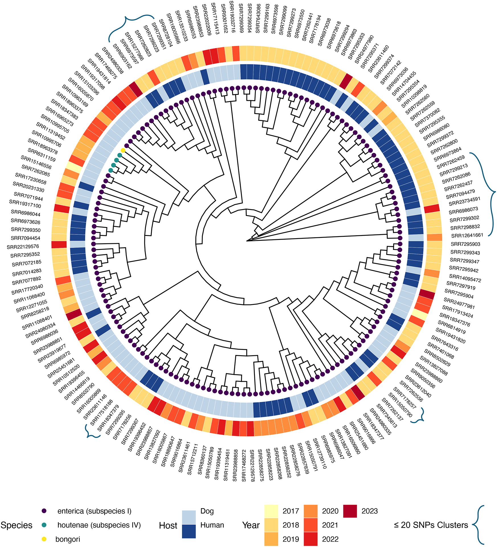 Description:Companion animals, like household dogs, are an overlooked transmission point for zoonotic pathogens such as nontyphoidal Salmonella (NTS). Given the proximity of dogs to humans and the use of critically important antibiotics in companion animal medicine, household dogs represent a risk for the spread of antimicrobial-resistant (AMR) Salmonella.|To this end, we aimed to leverage existing biosurveillance infrastructure to investigate AMR and the zoonotic potential of NTS isolated from dogs and humans. We identified all NTS strains isolated from domestic dogs via the Veterinary Laboratory Investigation and Response Network between May 2017 and March 2023 (N = 87), and spatiotemporally matched strains isolated from humans in the NCBI Pathogen Isolate Browser (N = 77). These 164 strains, collected from 17 states in the United States, formed the basis of our analysis. Strains isolated from dogs comprised diverse serovars, with most being clinically relevant to human health. All strains possessed AMR determinants for drug classes deemed critically or highly important by the World Health Organization. We identified sixteen NTS isolates from humans closely related to ≥1 of six dog-associated strains.|Collectively, our data emphasize the importance of antimicrobial stewardship and sustained biosurveillance beyond human- and agriculture-associated veterinary medicine, using a One-Health framework that accounts for all transmission points including companion animals.