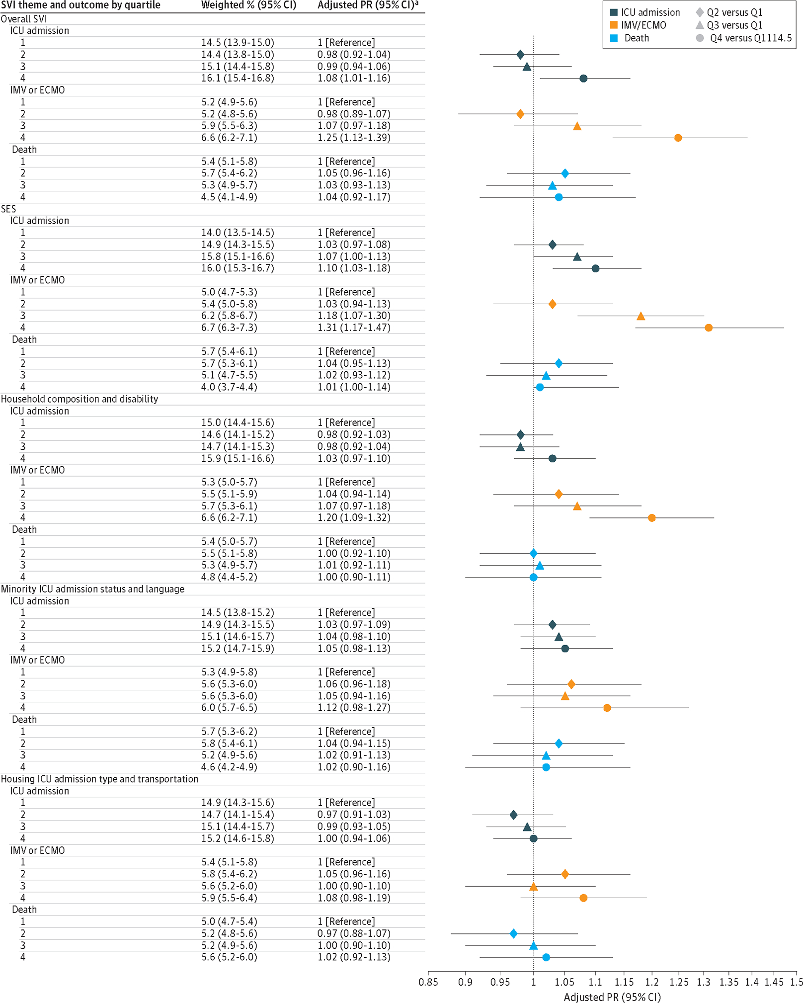 Among 57 964 sampled cases, the median (IQR) age was 71 (58–82) years; 55.5% (95% CI, 51.5%–56.0%) were female; 5.2% (5.0%–5.4%) were Asian or Pacific Islander, 18.3% (95% CI, 18.0%–18.6%) were Black or African American, and 64.6% (95% CI, 64.2%–65.0%) were White; and 6.6% (95% CI, 6.4%–68%) were Hispanic or Latino and 74.7% (95% CI, 74.3%–75.0%) were non-Hispanic or Latino. High social vulnerability was associated with higher prevalence of invasive mechanical ventilation and/or extracorporeal membrane oxygenation support (931 of 13 563 unweighted cases; adjusted prevalence ratio [aPR], 1.25 [95% CI, 1.13–1.39]), primarily due to socioeconomic status (790 of 11 255; aPR, 1.31 [95% CI, 1.17–1.47]) and household composition and disability (773 of 11 256; aPR, 1.20 [95% CI, 1.09–1.32]). Vaccination status, presence of underlying medical conditions, and respiratory symptoms partially mediated all significant associations. As social vulnerability increased, the proportion of patients receiving seasonal influenza vaccination declined (−19.4% relative change across quartiles; P < .001) as did the proportion vaccinated by October 31 (−6.8%; P < .001). No differences based on social vulnerability were found in in-hospital antiviral receipt, but early in-hospital antiviral initiation (−1.0%; P = .01) and prehospital antiviral receipt (−17.3%; P < .001) declined as social vulnerability increased.