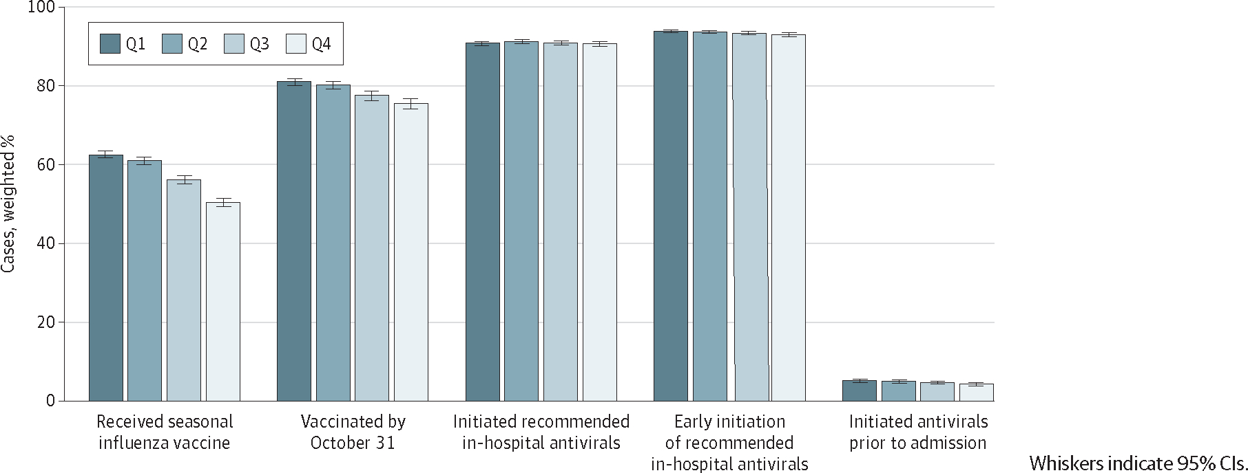 To characterize associations between social vulnerability and outcomes among patients hospitalized with influenza and to evaluate seasonal influenza vaccine and influenza antiviral utilization patterns across levels of social vulnerability.