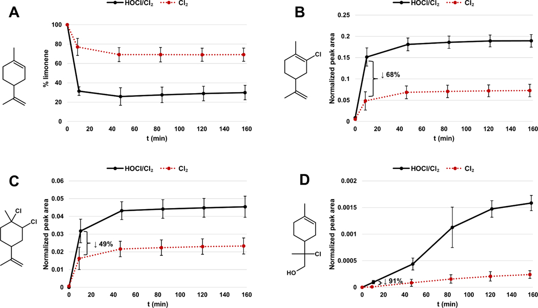 Description:During use of sodium hypochlorite bleach, gas-phase hypochlorous acid (HOCl) and chlorine (Cl|) are released, which can react with organic compounds present in indoor air. Reactivity between HOCl/Cl| and limonene, a common constituent of indoor air, has been observed. The purpose of this study was to characterize the chemical species generated from gas-phase reactions between HOCl/Cl| and limonene. Gas-phase reactions were prepared in Teflon chambers housing HOCl, Cl|, and limonene. The resulting chemical products were analyzed using gas-phase preconcentration, followed by gas chromatography and high-resolution mass spectrometry. Several chlorinated products were detected, including limonene species containing one, two, and three chlorines and limonene chlorohydrin. Product concentrations and yields were estimated for the most abundant products, and greater than 80% of transformed limonene was represented in the detected products. Temporal sampling of the reactions allowed time courses to be plotted for limonene decay and chlorinated limonene product generation under different conditions, including the treatments of HOCl/Cl|, Cl| only, high vs low relative humidity, and ± ozone. These experiments add product speciation, yield estimates, and an understanding of environmental factors affecting product formation to previous studies, further highlighting the chemical transformations initiated by sodium hypochlorite bleach in indoor air.