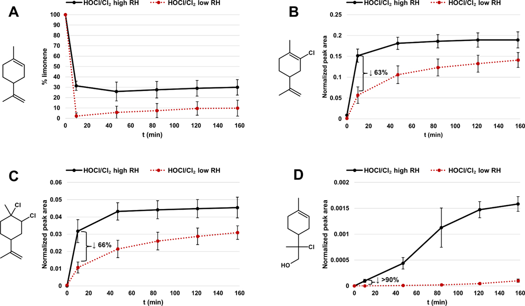 Factors Affecting Chlorinated Product Formation from Sodium Hypochlorite Bleach and Limonene Reactions in the Gas Phase