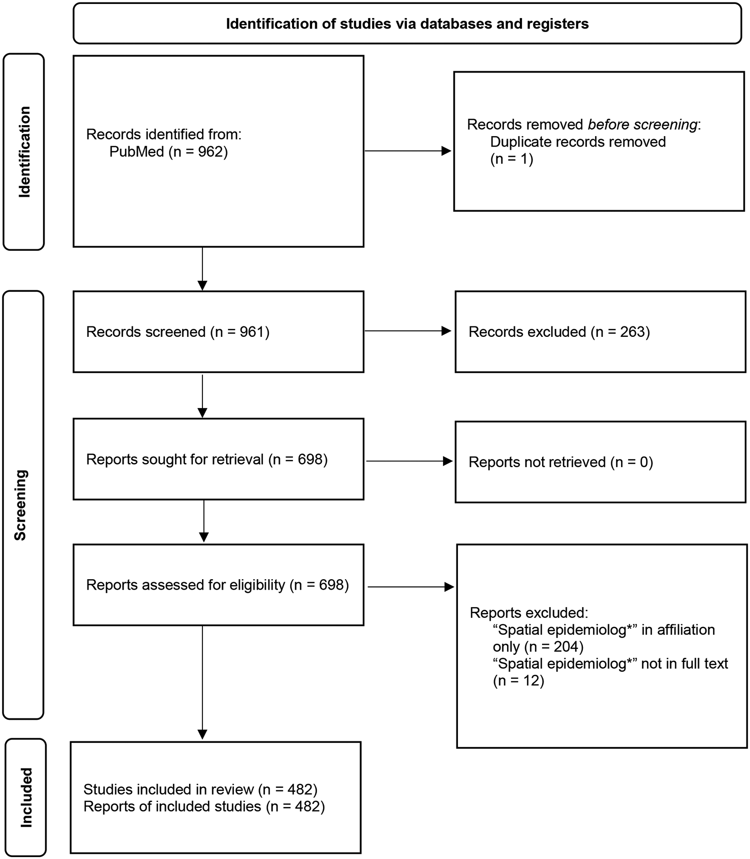 We conducted a systematic review of studies indexed in PubMed that used the term “spatial epidemiolog*” in the title, abstract, or keywords. Excluded papers were not written in English, examined disease in animals, or reported biologic pathogen distribution only. We coded the included papers into five categories (review, demonstration of method, descriptive, analytic, intervention) and recorded the unit of analysis (i.e., individual vs. ecological). We additionally examined papers coded as analytic ecologic studies using scales for lexical content.