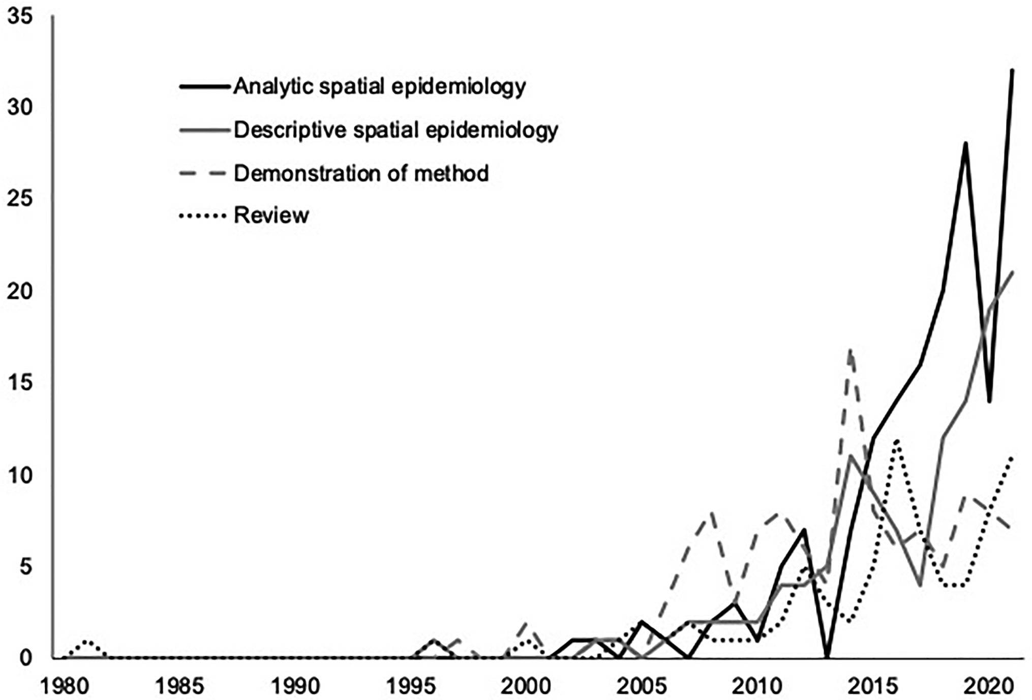 A total of 482 papers met the inclusion criteria, including 76 reviews, 117 demonstrations of methods, 122 descriptive studies, 167 analytic studies, and 0 intervention studies. Demonstration studies were most common from 2006 to 2014, and analytic studies were most common after 2015. Among the analytic ecologic studies, those published in later years used more terms relevant to spatial statistics (IRR =1.3, 95%CI: 1.1, 1.5) and causal inference (IRR =1.1, 95%CI: 1.1, 1.2).