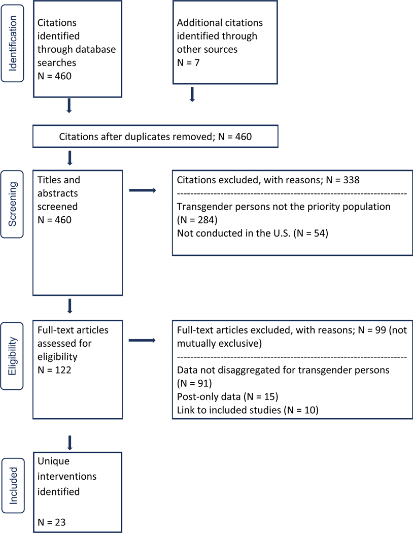 Description:This systematic review synthesized published literature (2000 - 2023) to identify HIV interventions specifically designed for transgender persons in the United States (PROSPERO registration number: CRD42021256460). The review also summarized strategies for improving outcomes related to the four pillars of the Ending the HIV Epidemic (EHE) initiative in the United States: Diagnose, Treat, Prevent, and Respond. A comprehensive search was conducted using the Centers for Disease Control and Prevention's HIV Prevention Research Synthesis Project database, which included over 120,000 citations from routine systematic searches in CINAHL, EMBASE, Global Health, MEDLINE, PsycInfo, and Sociological Abstracts. Of 23 interventions that met inclusion criteria, 94% focused on transgender women of color and 22% focused on young transgender persons aged 15-29 years old. Most interventions focused on Treat or Prevent, few focused on Diagnosis, and none focused on Respond. Twenty interventions (87%) showed improvement in at least one EHE related outcome and a quarter of these effective interventions were tested with randomized controlled trials. Common strategies observed in effective interventions include the following: engaging the community in intervention development; pilot-testing with the focus population to ensure appropriateness and acceptability; addressing social determinants of health (e.g. stigma, discrimination, violence) through empowerment and gender-affirming approaches; increasing access to care, prevention, and services through co-location and one-stop shop models; and utilizing peer-led counseling, education, support, and navigation. Continuous effort is needed in addressing gaps, including more research for transgender men and rural settings and for how best to adopt and adapt best practices for subgroups of transgender population.