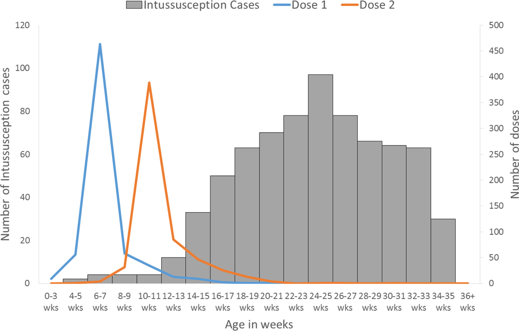 Intussusception cases meeting international (Brighton level 1) criteria were enrolled using active surveillance. Rotavirus vaccination status was confirmed by review of the vaccine card or clinic records. The risk of intussusception within 1–7 and 8–21 days of vaccination among children 28–245 days of age was assessed using the self-controlled case-series method.