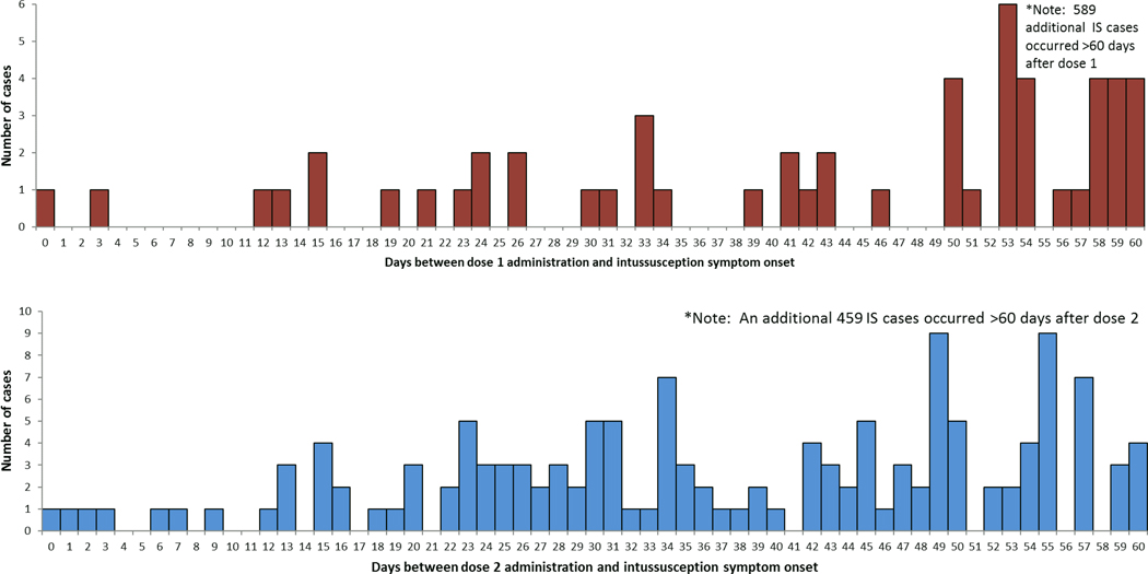 Data from 717 children with intussusception and confirmed vaccination status were analyzed. One case was observed in the 1–7 days and 6 cases in the 8–21 days post dose 1. Five cases and 16 cases were observed in the 1–7 days and 8–21 days post dose 2. No elevated risk of intussusception was detected in the 1–7 days post dose 1 (relative incidence (RI): 0.25; 95% confidence interval (CI), <0.001–1.03) or in the 1–7 days post-dose 2 (1–7 days: RI: 0.76; 95% CI, 0.17–1.70). Similarly, no elevated risk was detected in the 8–21 or 1–21 days post dose 1 or post dose 2.